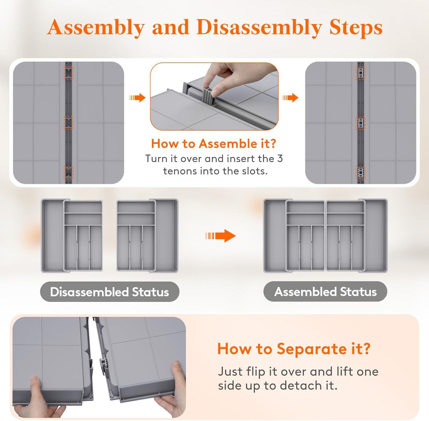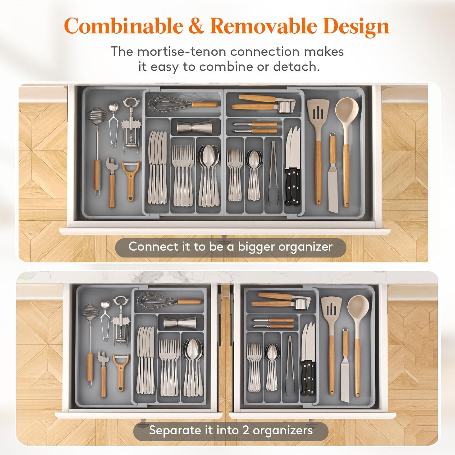 Combinable and Removable Design: The mortise-tenon connection satisfies extra-large drawer storage needs. The silverware organizer for kitchen drawers is assembled with 3 plugs in the middle, offering the flexibility to combine or detach them as separate storage boxes as required.