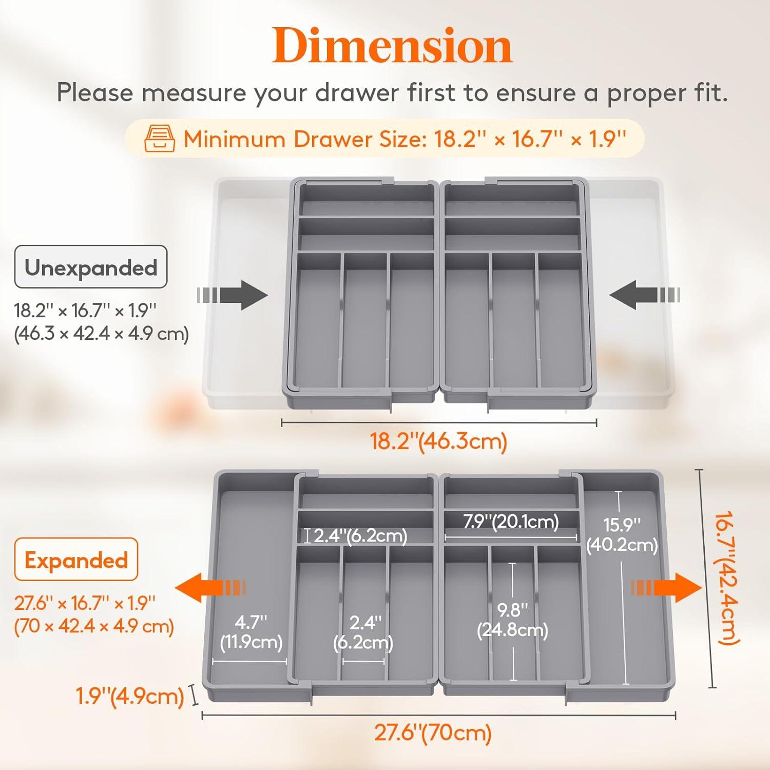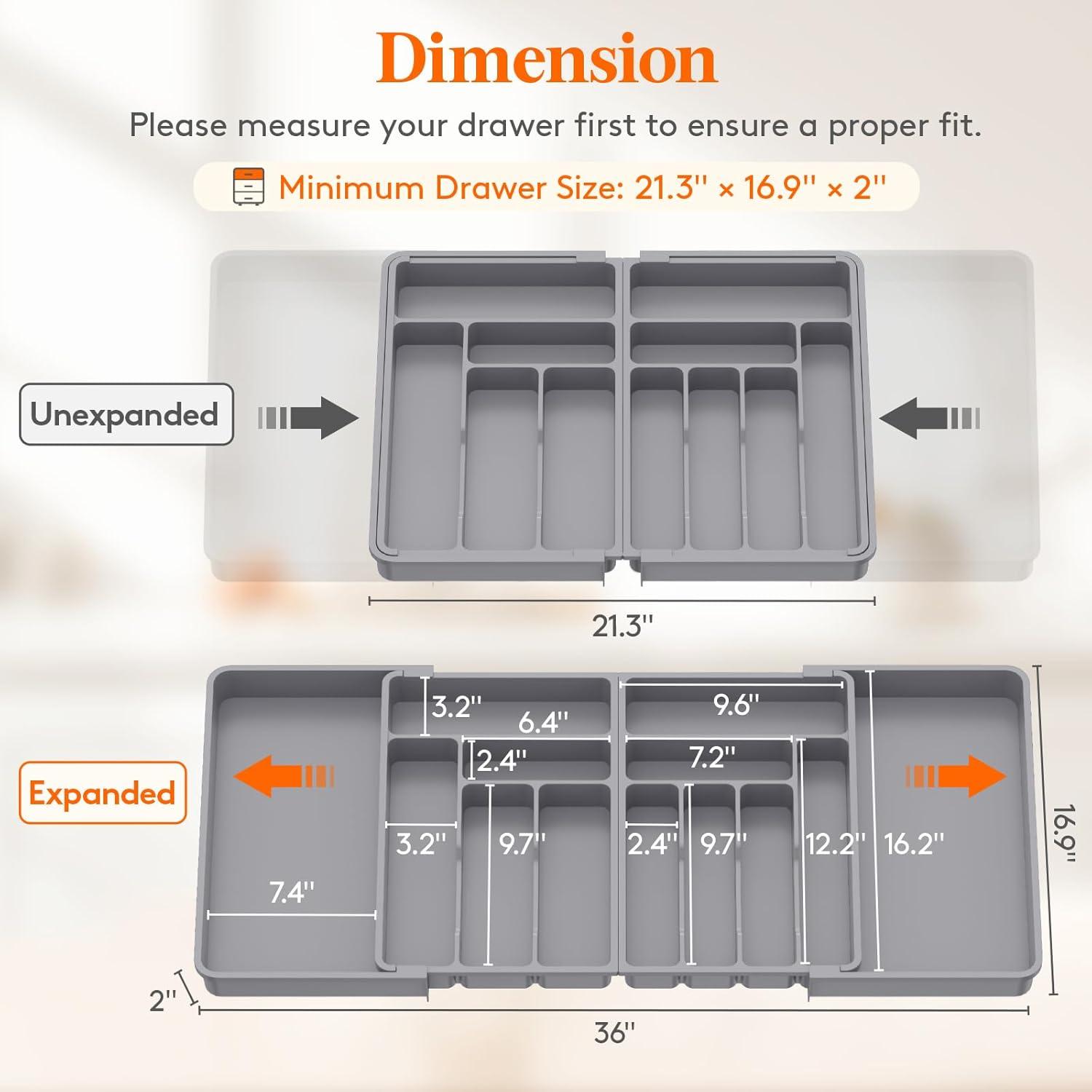 Adaptable to Your Drawer Size: This large silverware drawer organizer is adjustable to fit different drawer sizes, ranging from 21.3″ to 36″. It measures 36″ × 16.9″ × 2″ when fully expanded and 21.3″ × 16.9″ × 2″ when fully folded. Please measure your drawer dimensions before ordering.