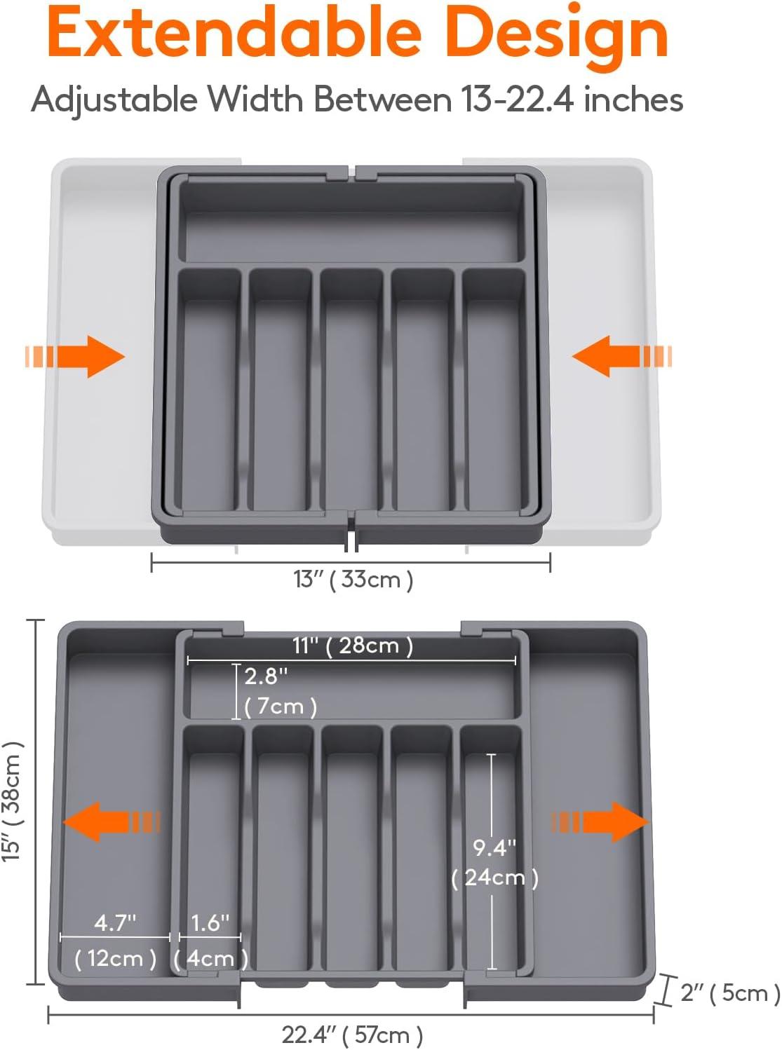 Adjustable Design: With its retractable design, The Lifewit silverware organizer fits drawers of various sizes and shapes. It measures 13'' wide when folded while reaching 22.4'' when fully expanded. This universal utensil drawer organizer helps you maximize storage space efficiently while keeping your utensils neatly organized and easily accessible