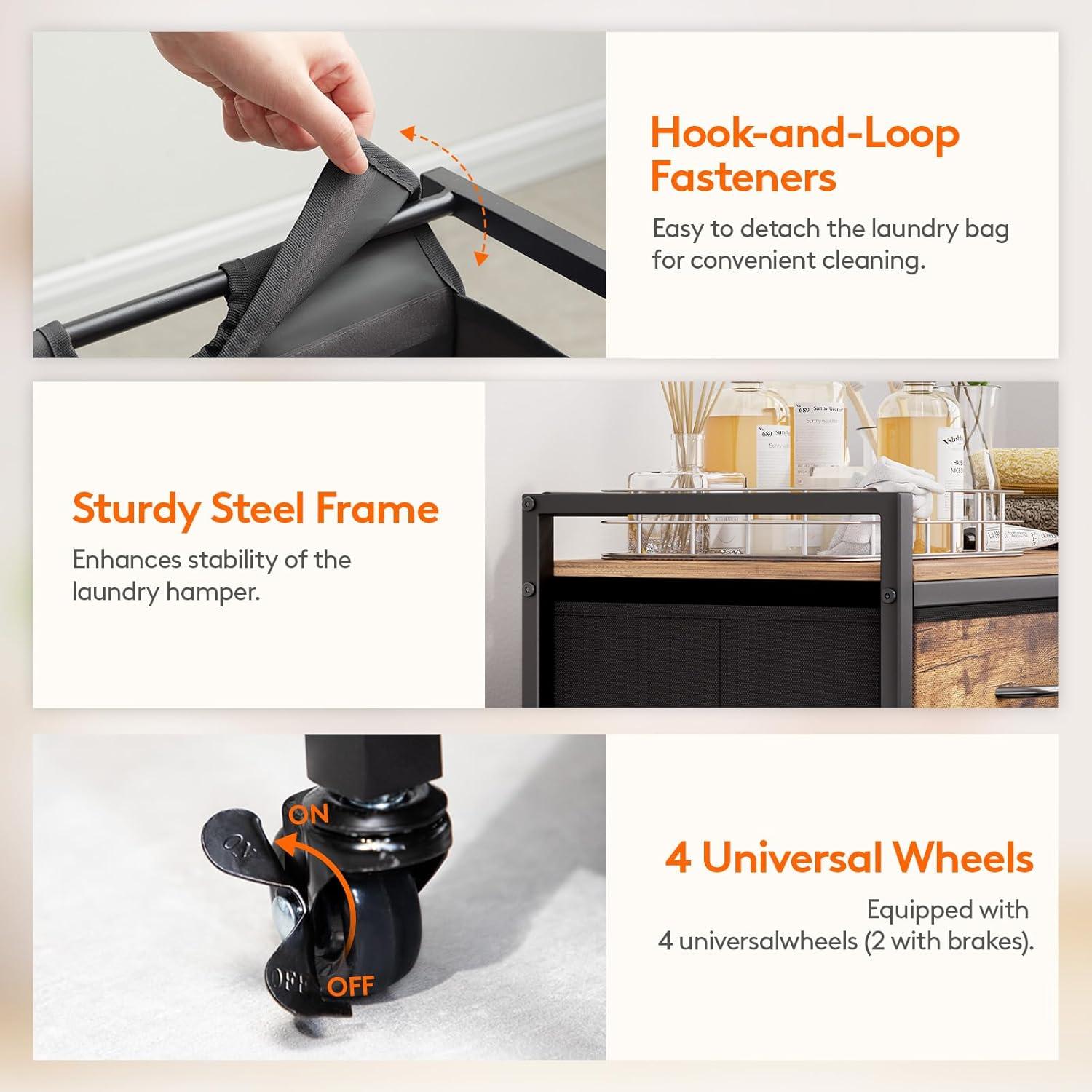 Caster Wheels with Brakes: 4 silent wheels with 2 lockable brakes ensure easy mobility and stability, allowing you to move the laundry sorter from the bedroom to the laundry room effortlessly
