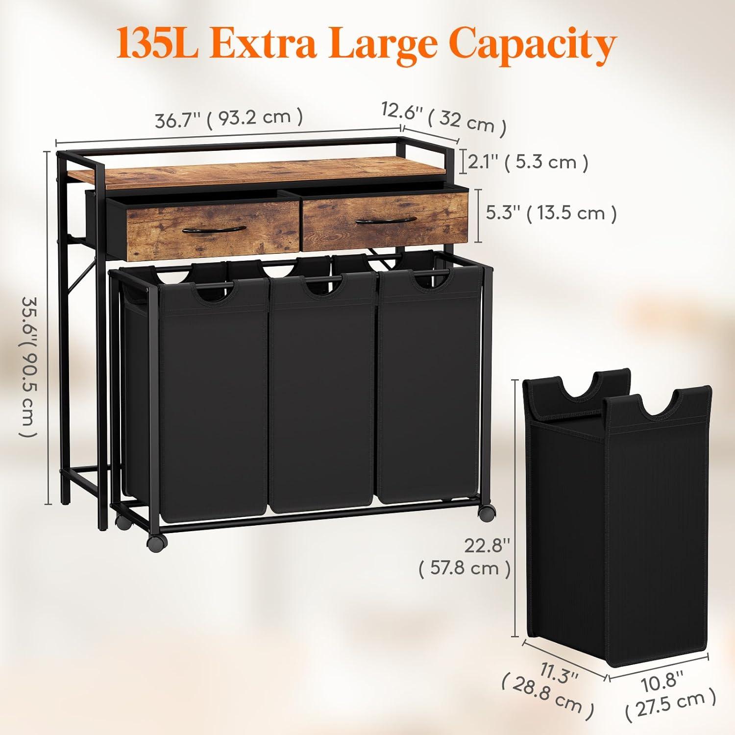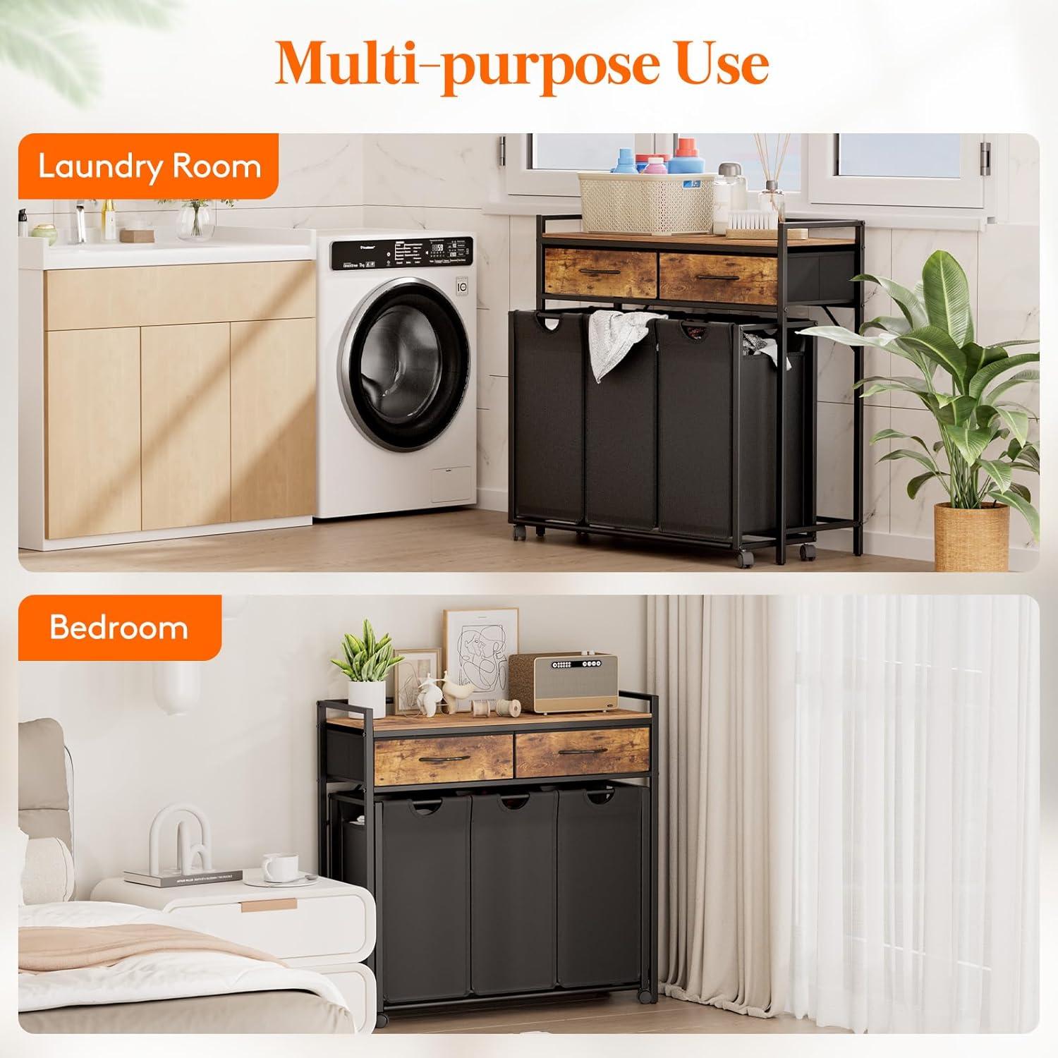 Lifewit Laundry hamper 3 Section, Large Rolling Laundry Sorter with Shelf & 2 Drawers, Pull-Out Laundry Basket Organizer with Wheels and Removable Bag for Laundry Room Bathroom, Rustic Brown and Black(White)