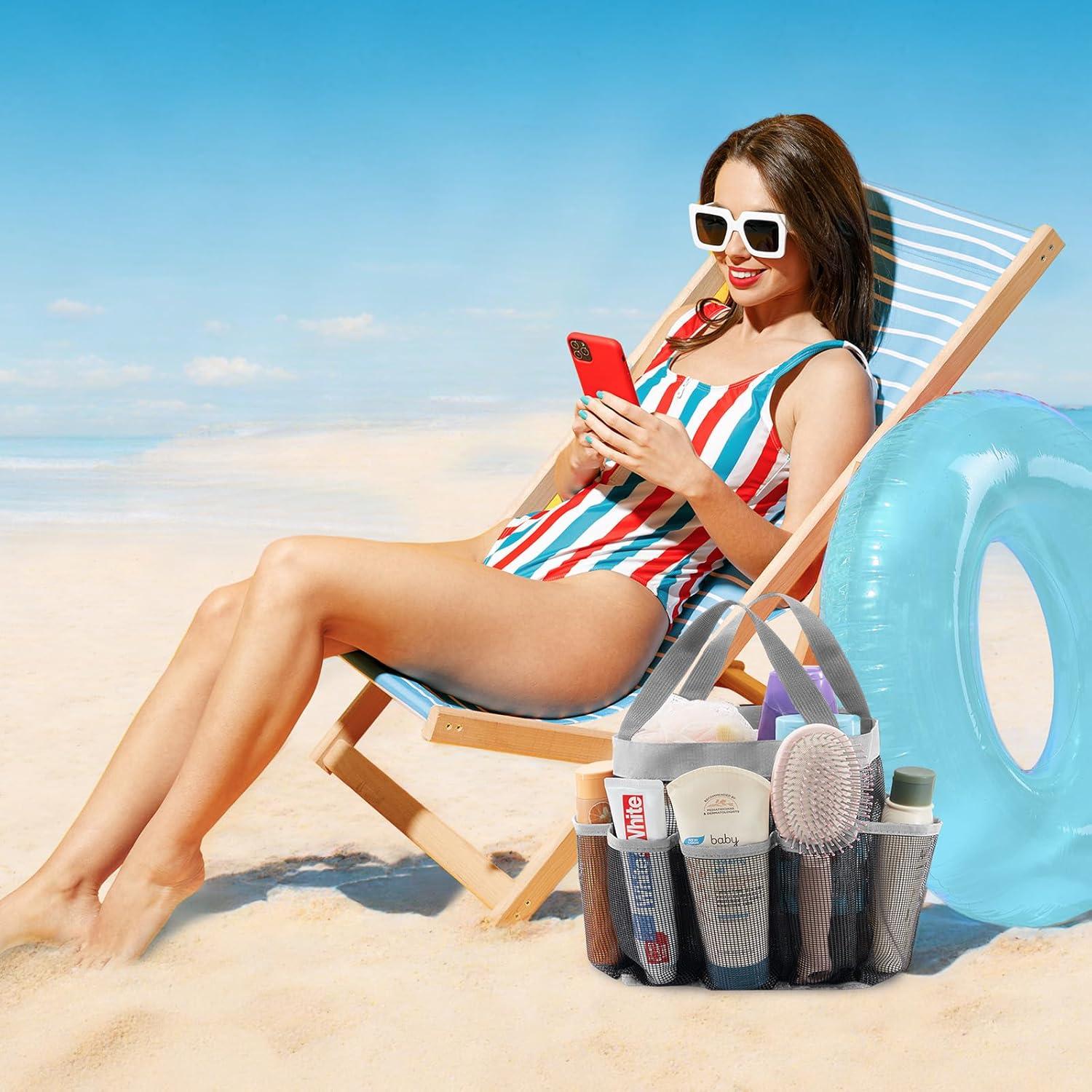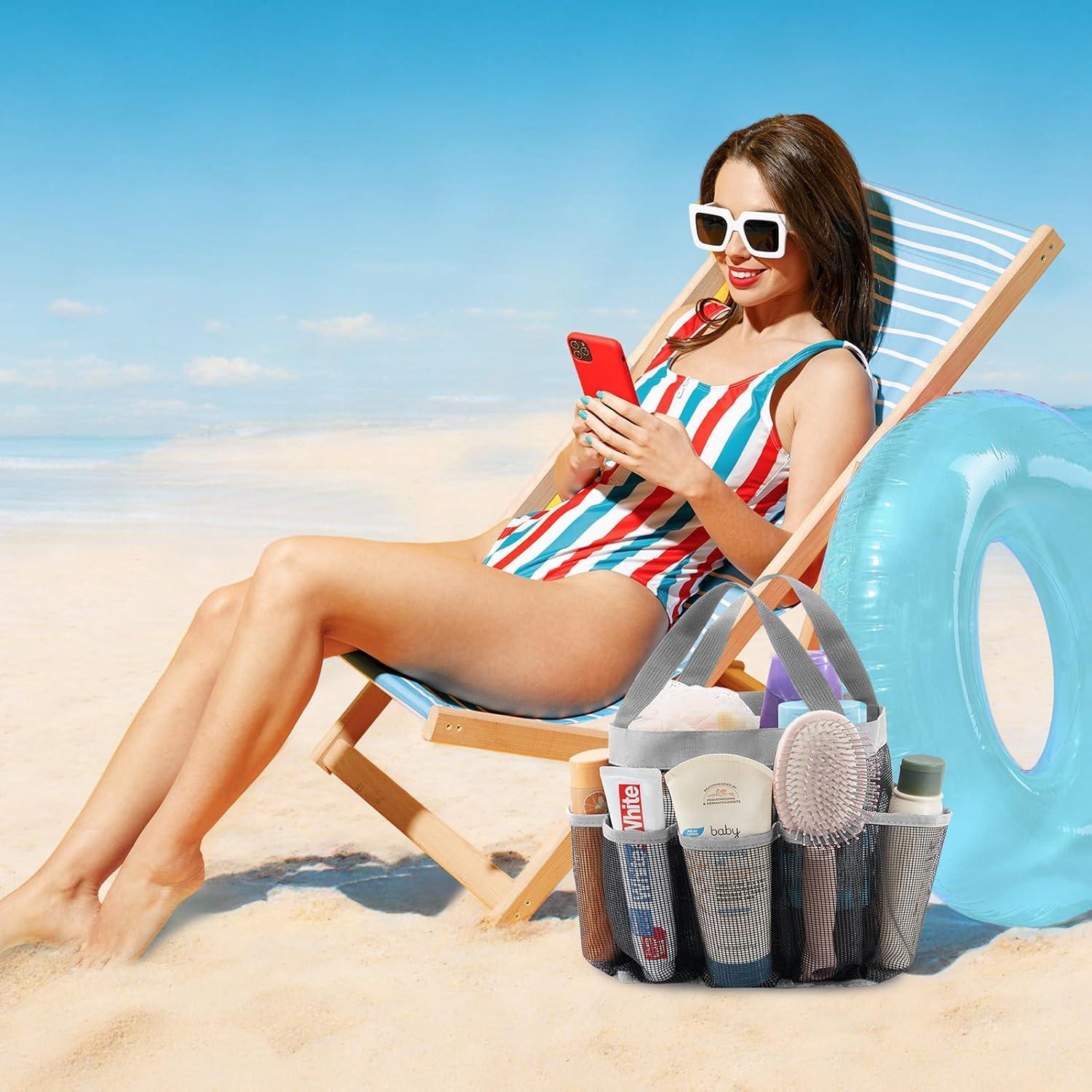 Plenty of Storage Space: This portable shower caddy with dimensions of 7.5″ ( 19cm ) x 6.7″ ( 17cm ) x 9.5″ ( 24cm ), has 7 side pockets and a large storage compartment in the center to hold all your bathroom accessories: towels, lotions, gels, shampoo, conditioner, soap, body wash, shavers, makeup, sunglasses, razor and more.