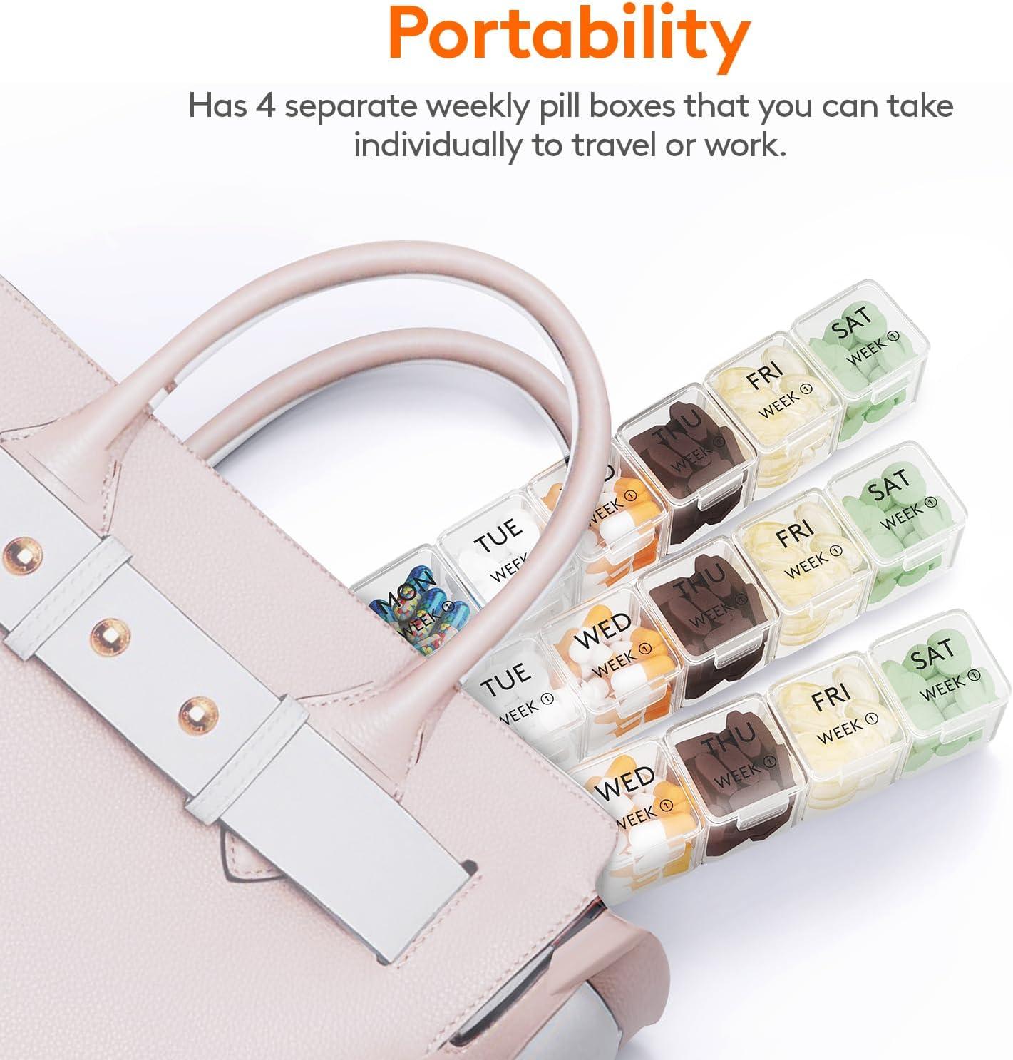 Monthly Medication Plan: Lifewit Monthly Pill Organizer comes with 4 individual weekly pill boxes for a total of 28 small pill boxes to organize 1 months' worth of pills at a time. You can instantly know if you have taken medicine that day and take your medicine on schedule. Ideal for people with multiple prescriptions