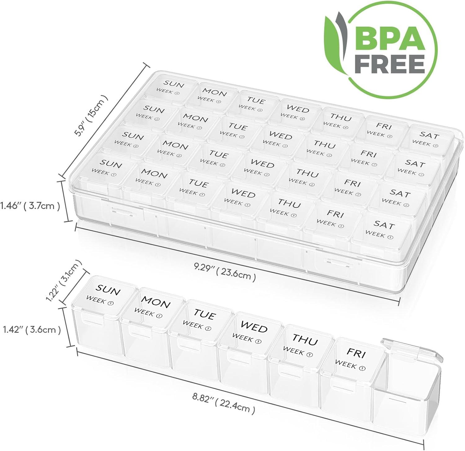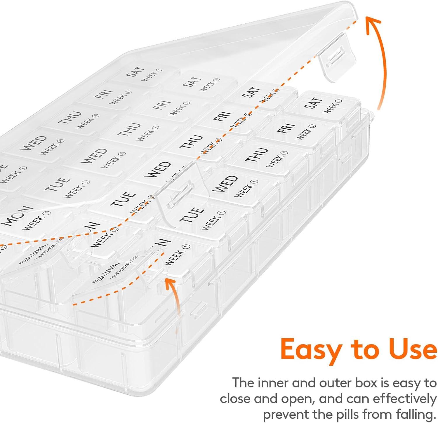 Monthly Medication Plan: Lifewit Monthly Pill Organizer comes with 4 individual weekly pill boxes for a total of 28 small pill boxes to organize 1 months' worth of pills at a time. You can instantly know if you have taken medicine that day and take your medicine on schedule. Ideal for people with multiple prescriptions.