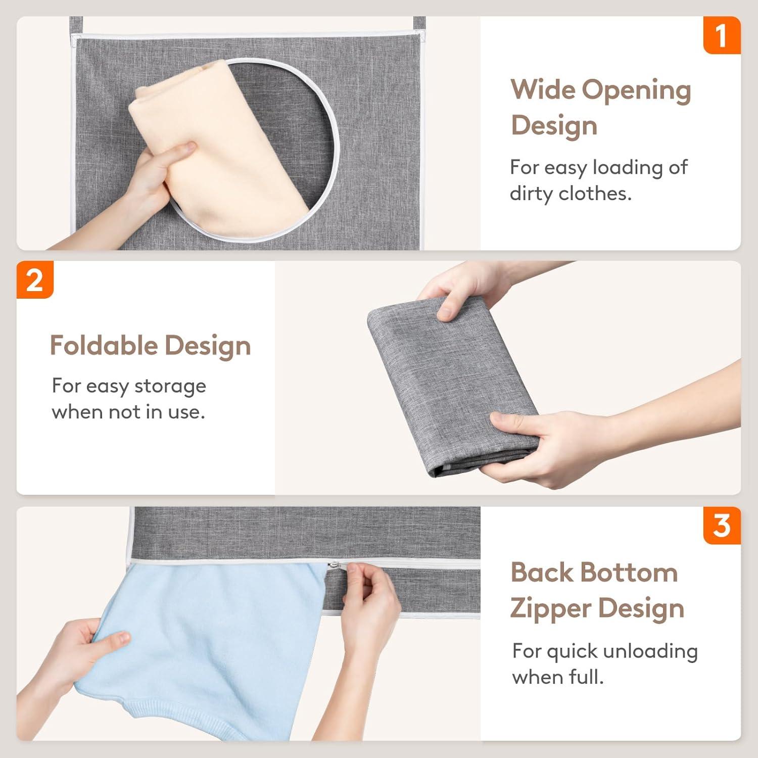 Easy to Use: The over the door hamper for bathroom features a wide opening design for easy loading of dirty clothes and a smooth zipper at the back bottom for quick unloading when full. Folds up for storage when not in use.