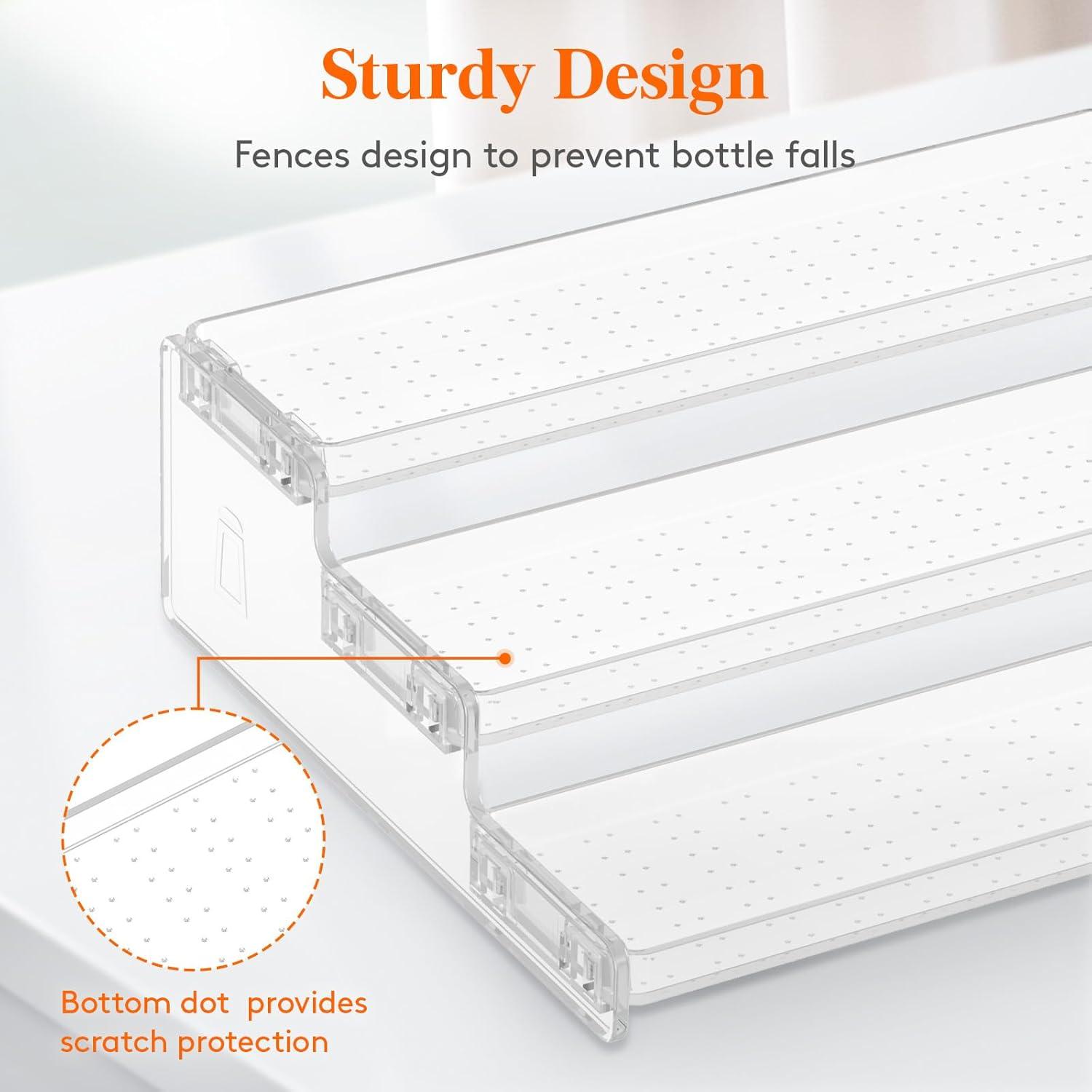 Sturdy Design: The vertical spice organization for cabinet has surrounding fences on each level and a rounded bump design on the floor of each layer. This provides secure and stable storage for your jars and bottles, preventing any slippage or breakage. Rest assured that your items are reliably protected, giving you peace of mind.