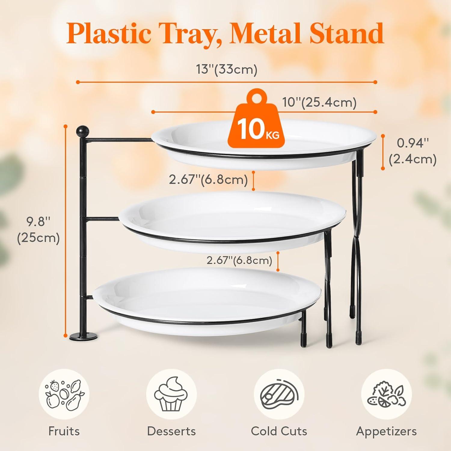 Premium Durability: The 3 tier serving tray is made from sturdy food-grade PET plastic, which is BPA-free, shatter-resistant and crack-proof; The three-layer 10 inches (25.4 cm) tray is perfect for showcasing desserts, appetizers, fruits, and vegetables