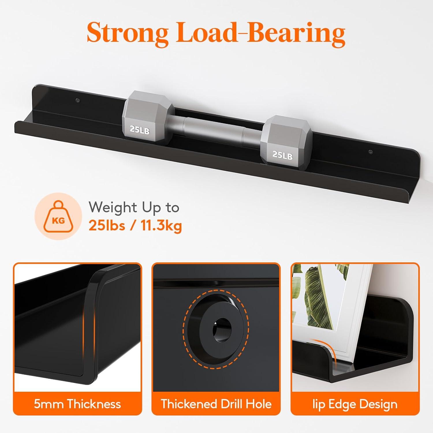 Product Information: This floating shelf features an extended design with options of 24″ and 36″ lengths. The 24″ shelf supports up to 25 lbs and measures 24″ × 3.45″ × 1.89″, making it ideal for efficiently utilizing wall space and organizing various items
