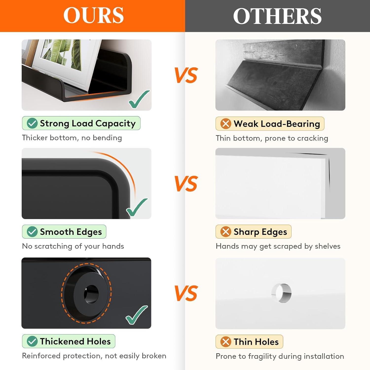 Easy to Install: Our floating shelves feature an easy installation process, allowing you to immediately enjoy your new wall decor. Equipped with all the necessary accessories and intuitive instructions, you can effortlessly install these black shelves