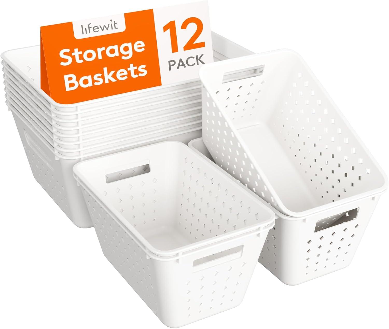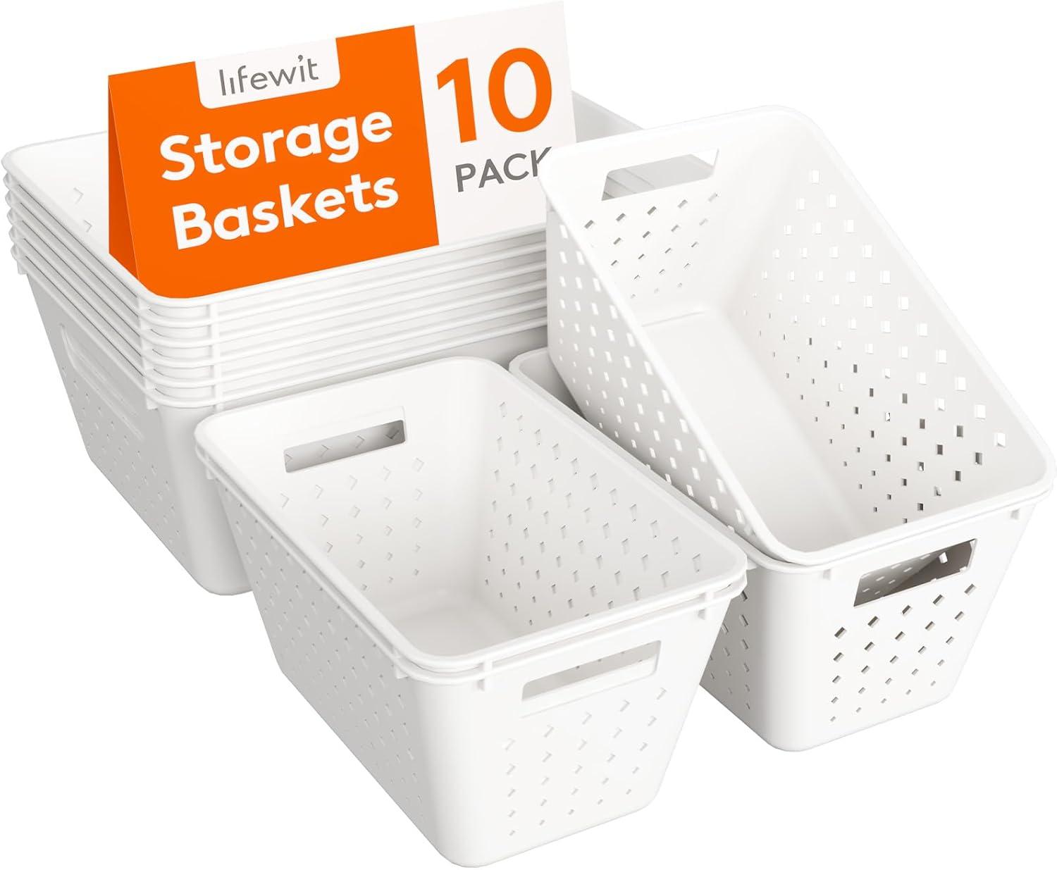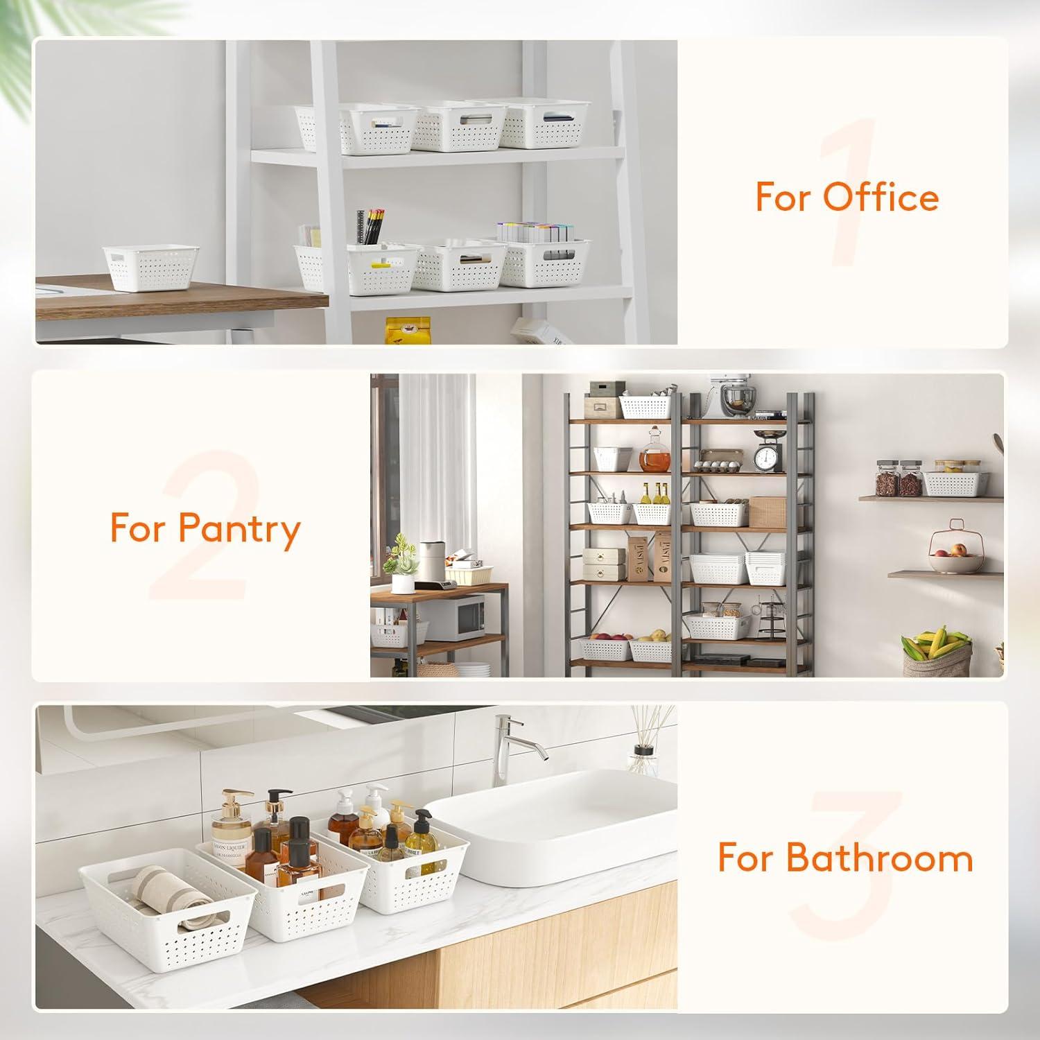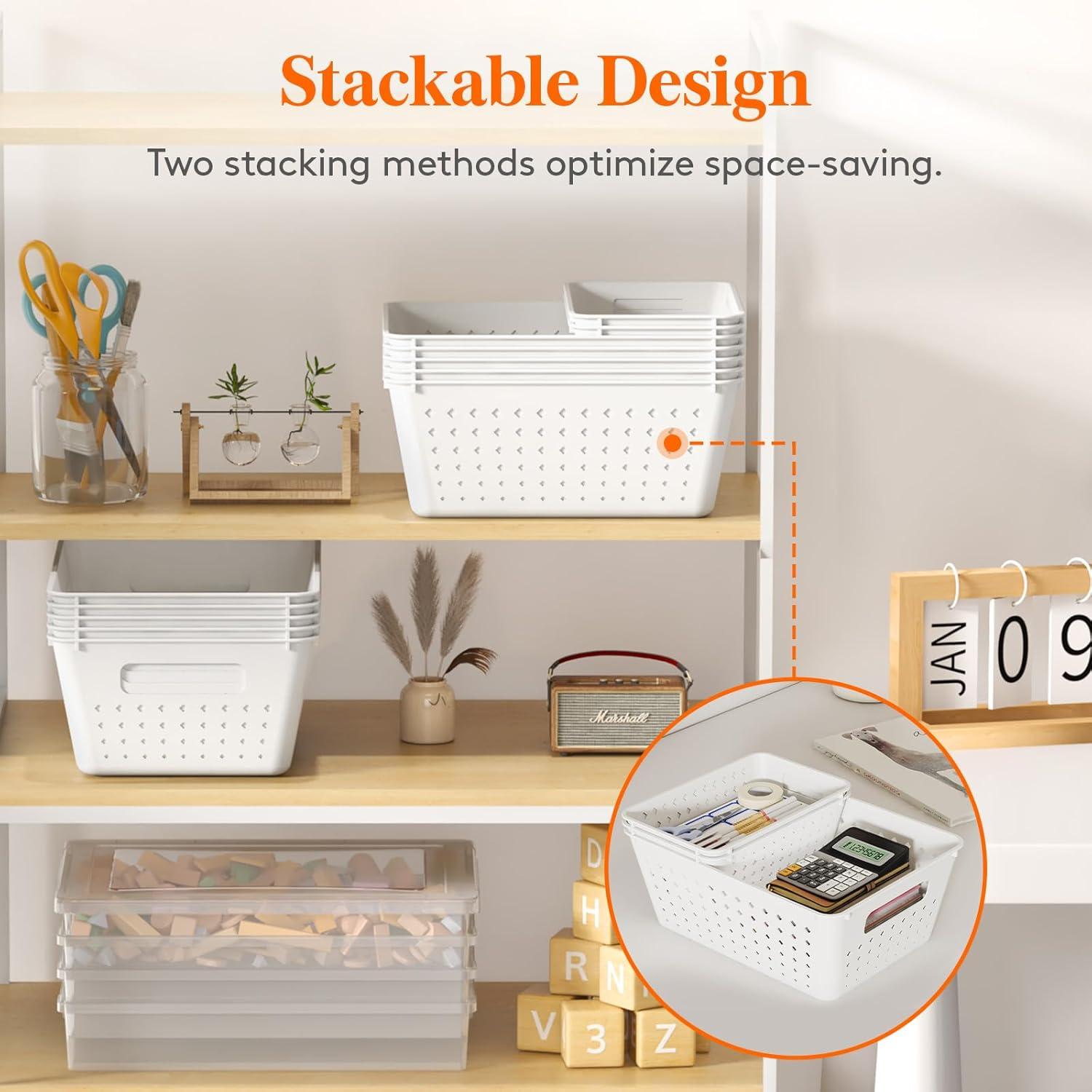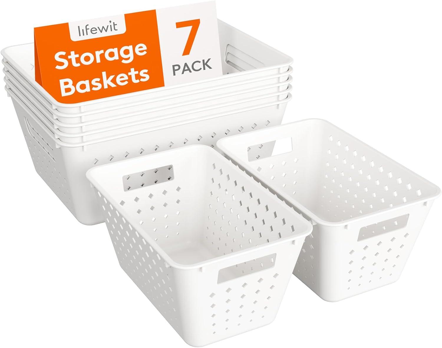 Lifewit Plastic Storage Basket, 7 Pack Stackable Storage Bins for Organizing, Multi Size Open Containers for Shelving, Pantry, Office and Cabinet, 5 Large and 2 Small Size, Black(White)