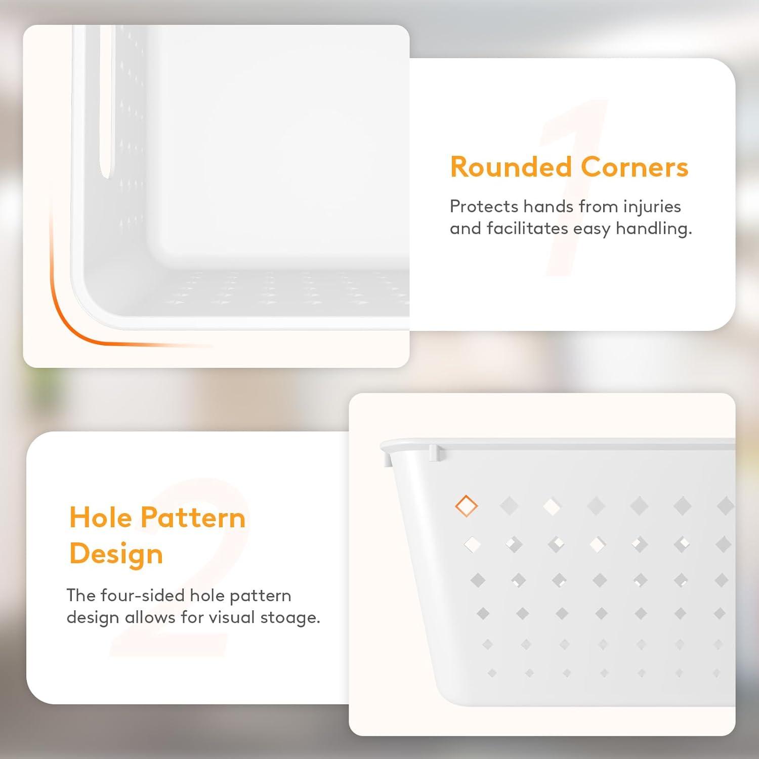 Portable Handles: The plastic storage baskets are equipped with handles on both sides, making them easy to grip and move to any desired location for storage. Whether you choose to place them on your kitchen counter, in a cupboard, or a snack cabinet, these baskets give you quick and easy access to your items with the pull of a handle.