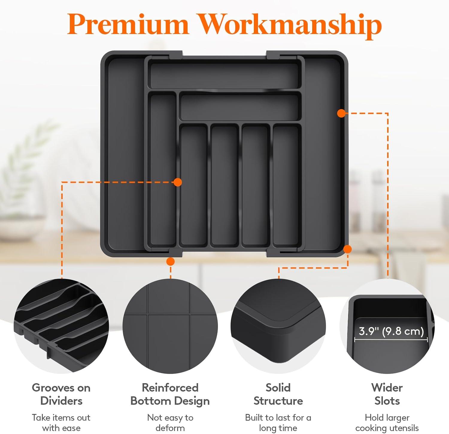 Sort Your Silverware: The silverware tray comes with 7-9 compartments, creating more space in drawers for spoons, cutlery, and flatware. The expandable sections are ideal for storing larger cooking utensils. Streamline your cooking with a no-install organizer that keeps cutlery at your fingertips