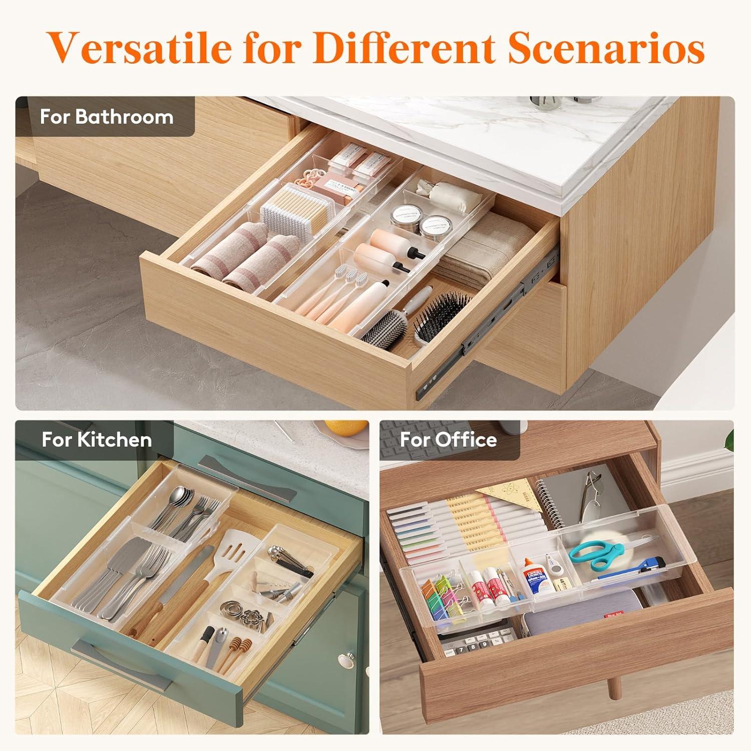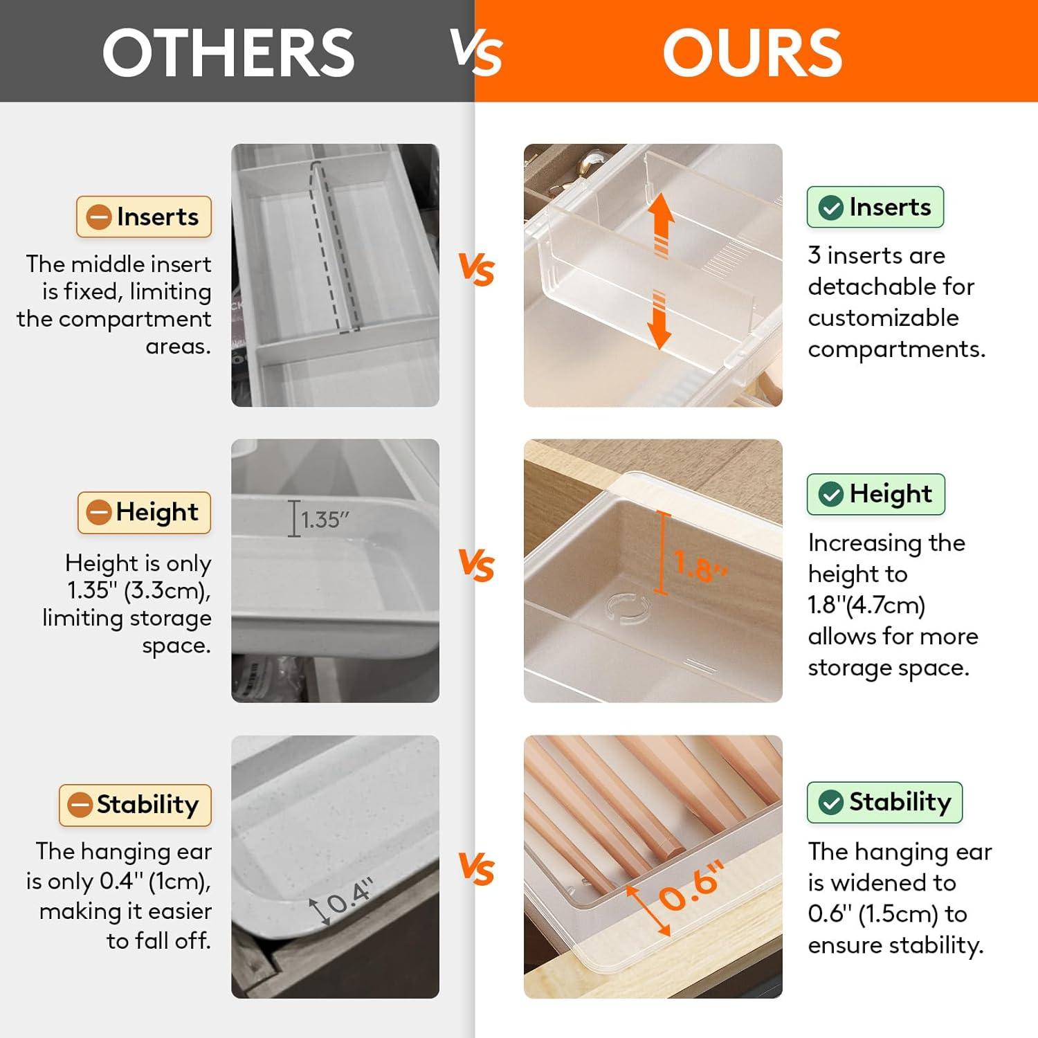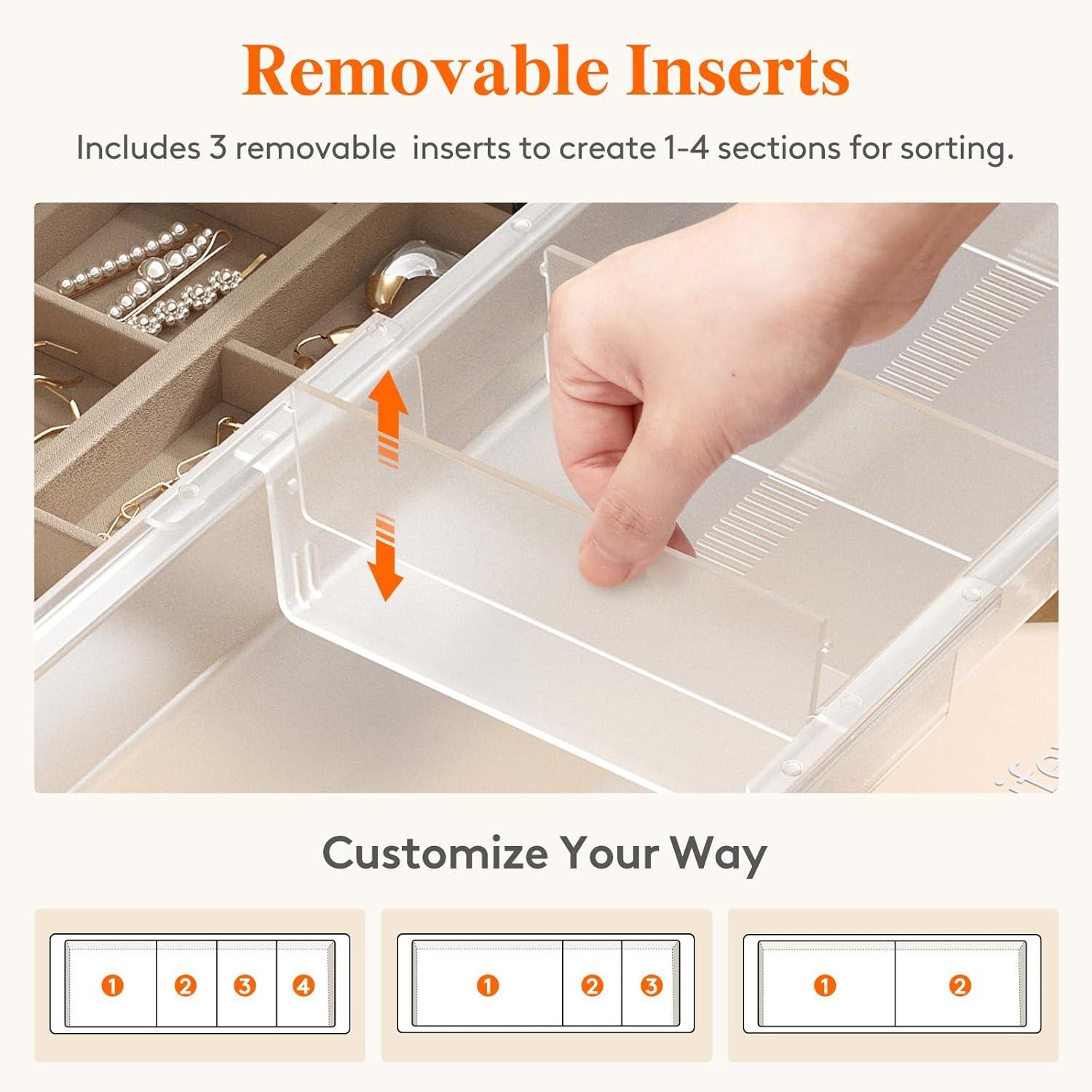 Removable Inserts: The adjustable drawer organizer comes with three removable inserts that can be easily assembled to create 1 to 4 compartments, allowing for customized storage of various small items