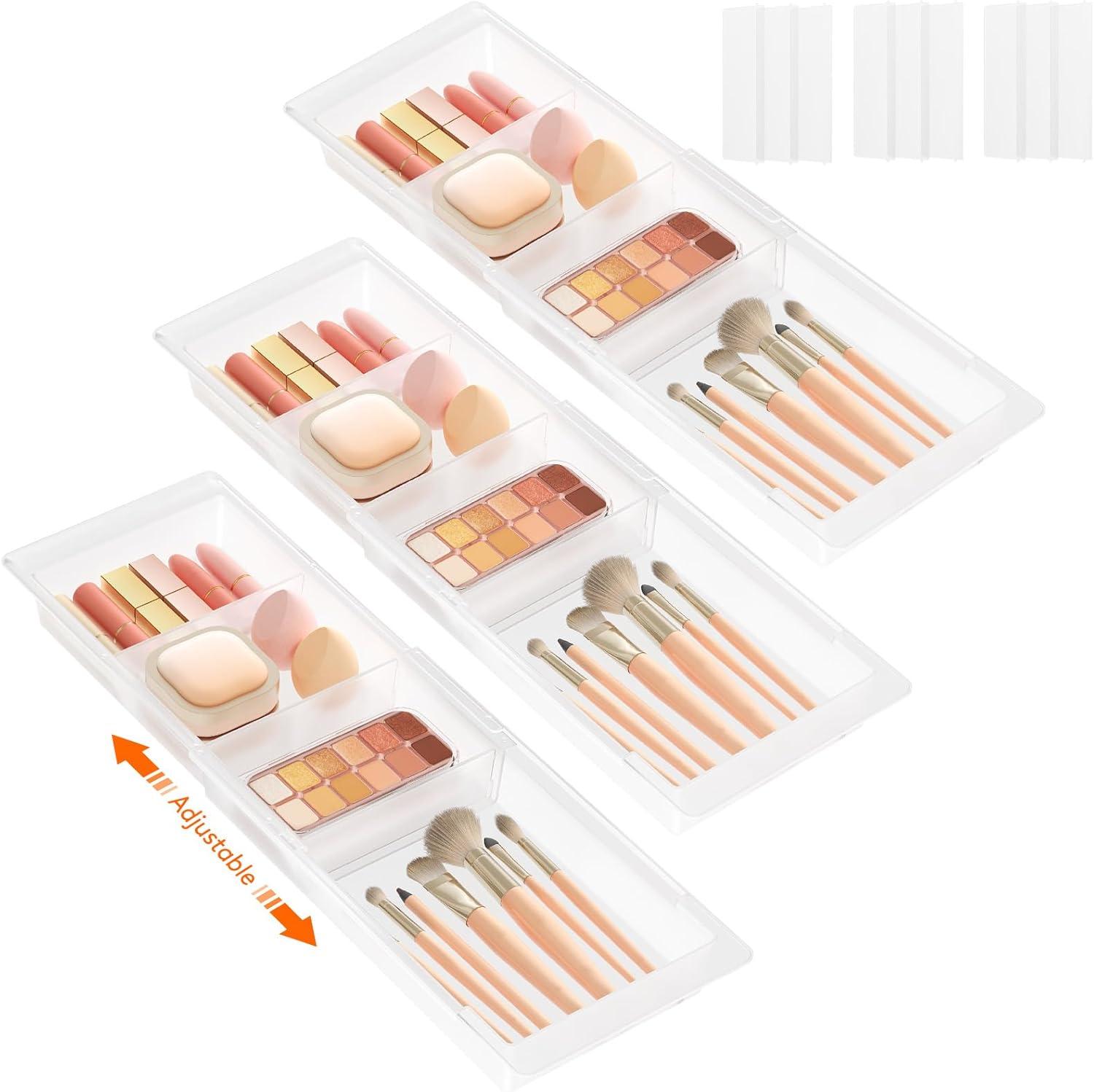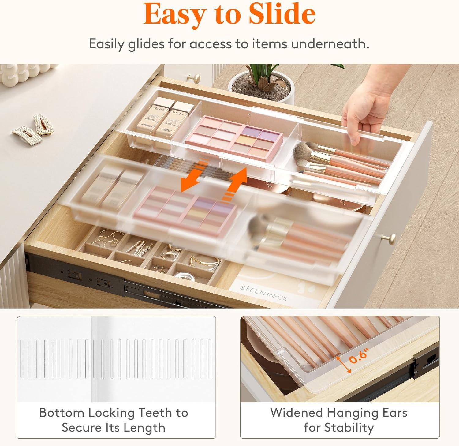 Stay on Top & Pushable: The bottom of the makeup drawer organizer tray features a locking teeth design that secures its length, with widened hanging ears for stability, preventing slipping. It slides easily for access to items stored below and can also be used directly inside the drawer