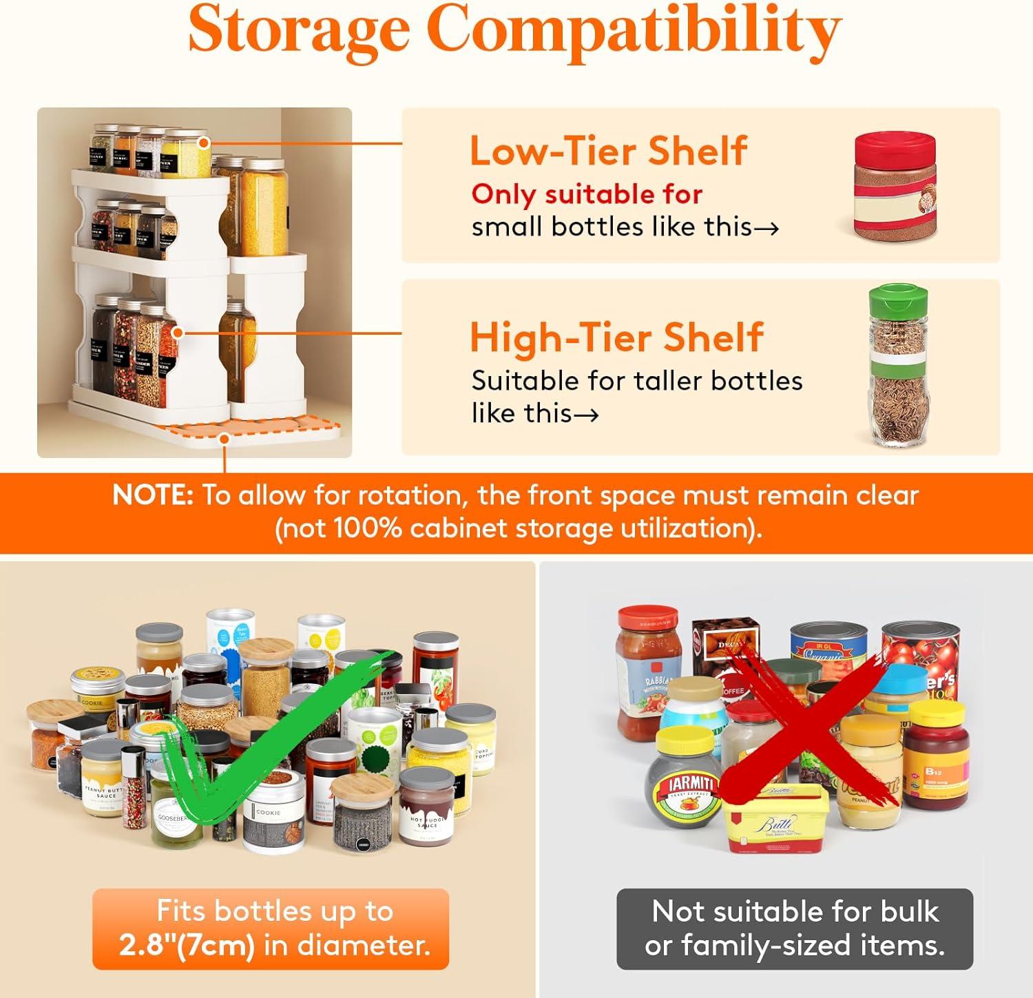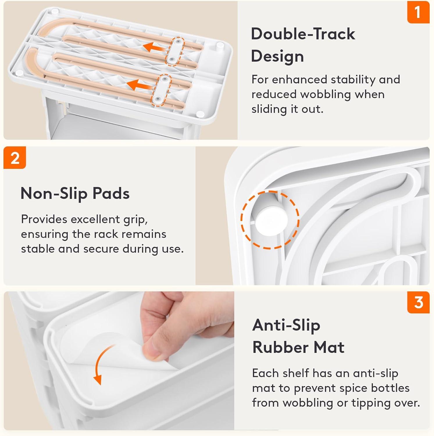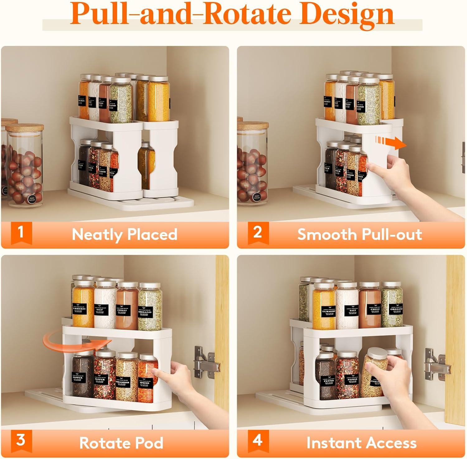 Pull-and-Rotate Design: This spice organizer for cabinet features an innovative pull-and-rotate function, allowing you to easily access and identify your spices. The bottom sliding dual tracks enhance stability when pulling it out. You can also place multiple organizers side by side to expand your spice organization