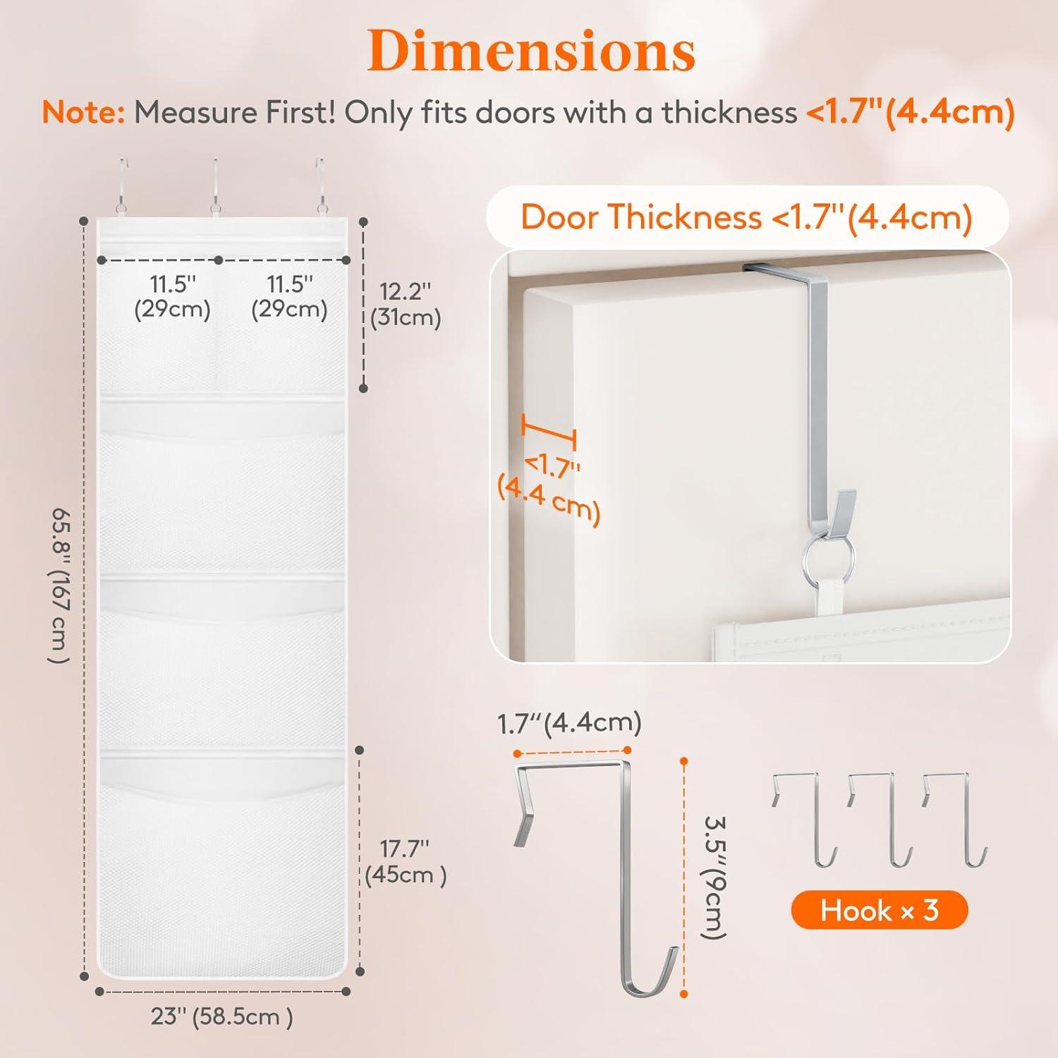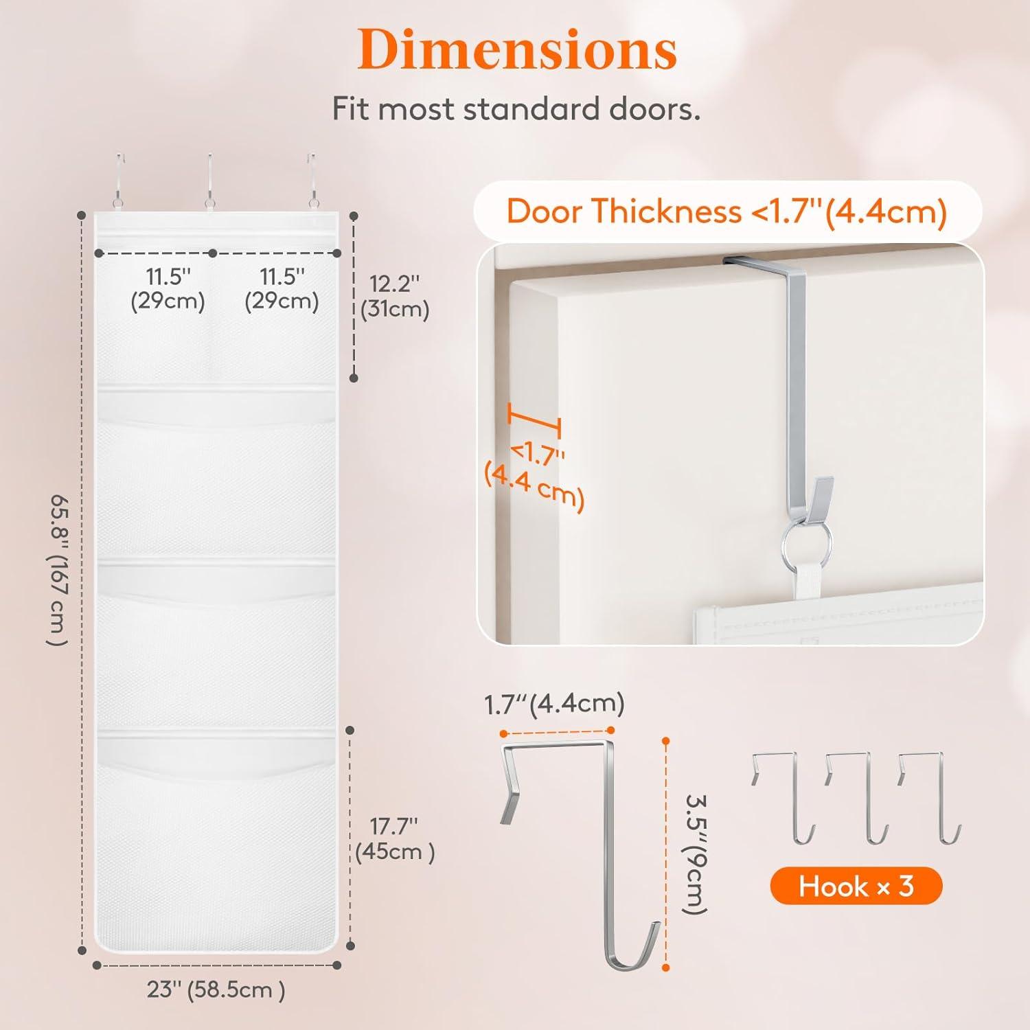 Extra Large Capacity: Measuring 23″ x 65.8″ (58.5 x 167cm), this over the door organizer features 3 large and 2 smaller mesh pockets, offering ample space for stuffed animals, toys, diapers, towels, wet wipes and other daily essentials. The top 4 pockets are 12.2″ (31 cm) high, while the bottom pocket is designed taller at 17.7″ (45 cm), ideal for larger items. It effectively utilizes vertical space, freeing up additional room in your home