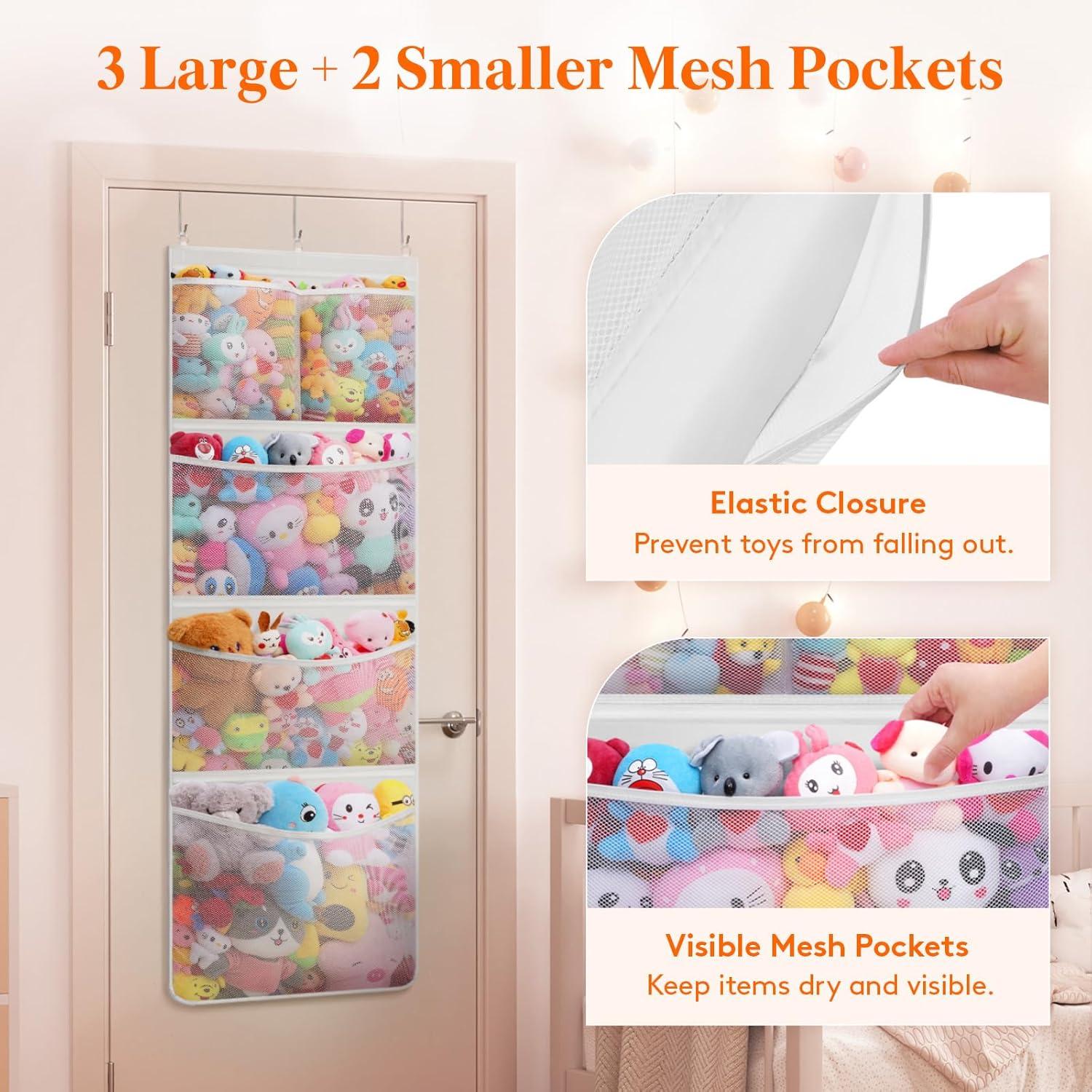 Lifewit Stuffed Animal Storage for Door Up to 1.7" Thick, 1 Pack Over the Door Organizer with 5 Expandable Mesh Pockets, Breathable Oxford Fabric Hanging Kid Plush Baby Toy Holder for Nursery, White(White)