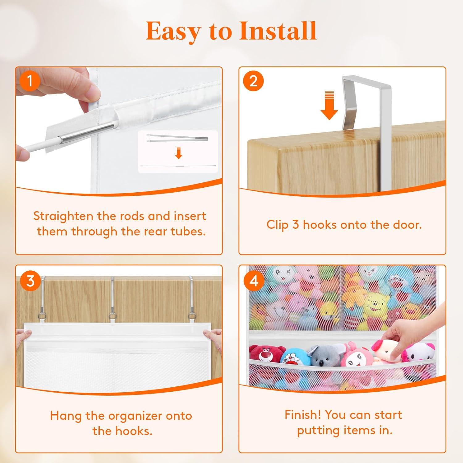 Easy Installation: Setting up this toy hammock is a breeze with a two-step process. Insert the 4 fiberglass rods through the rear fabric tubes and hang the bag on the door using the hooks. When not in use, simply remove the hooks and rods, and fold it flat to save space. Note: Measure before purchase! Ensure your door is less than 1.7″ (4.4 cm) thick for a proper fit. It will not interfere with closing on most standard doors