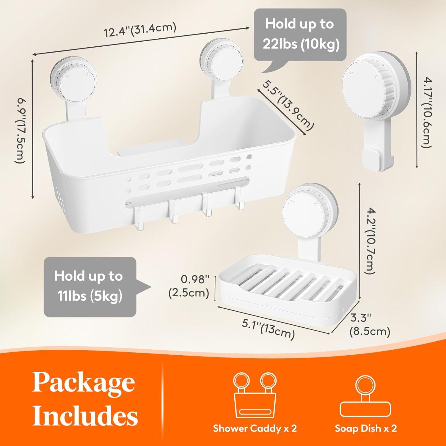 Super Strong Suction: The suction cup shower caddy set features high-quality suction cups that provide strong hold. The shower caddy can support up to 22 lbs (10 kg), while the soap dish can hold up to 11 lbs (5 kg). Both are waterproof and oil-proof, and the reusable suction cups ensure a secure hold in wet bathrooms or kitchens