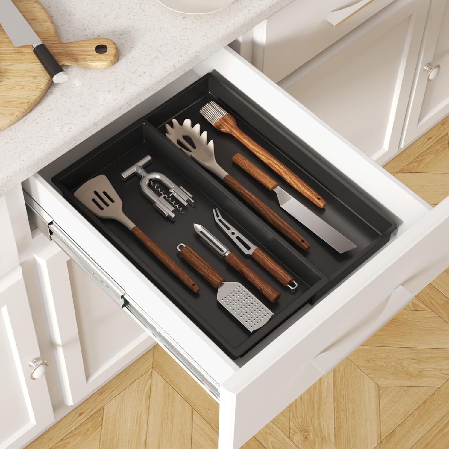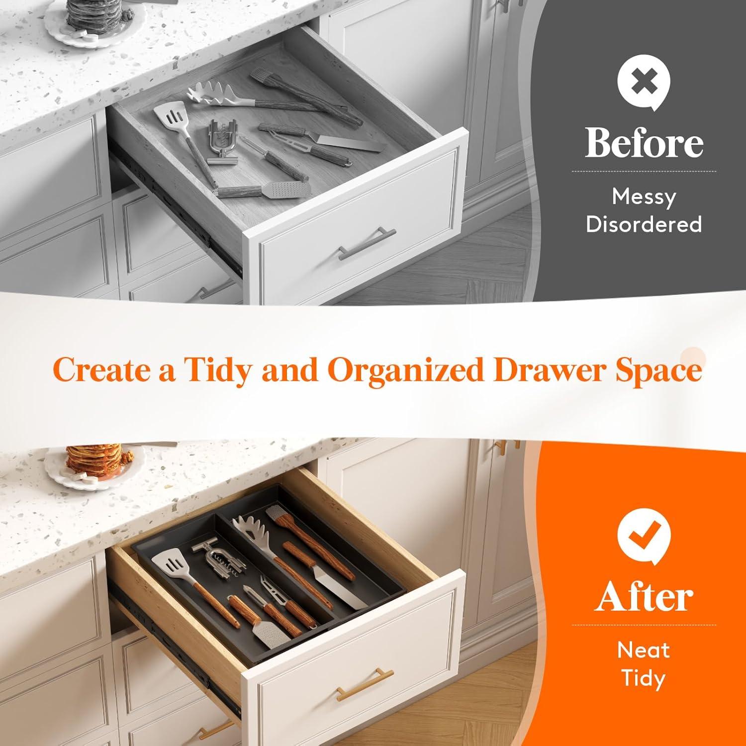 Sort Your Silverware: The silverware tray comes with 3-4 compartments, creating more space in drawers for spatulas, ladles, tongs, utensil sets, and whisks. Streamline your cooking with a no-install organizer that keeps cutlery at your fingertips