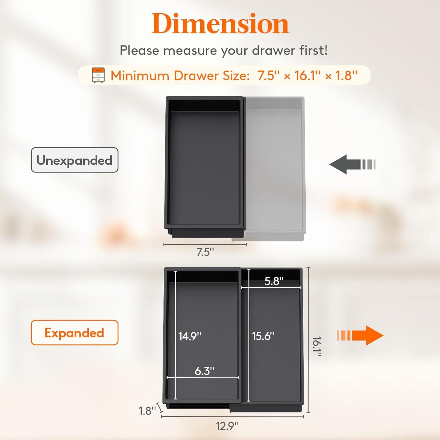 Adjustable Design: With its retractable design, The Lifewit silverware organizer fits drawers of various sizes and shapes. It measures 11.9'' wide when folded while reaching 17.3'' when fully expanded. This universal utensil drawer organizer helps you maximize storage space efficiently while keeping your utensils neatly organized and easily accessible