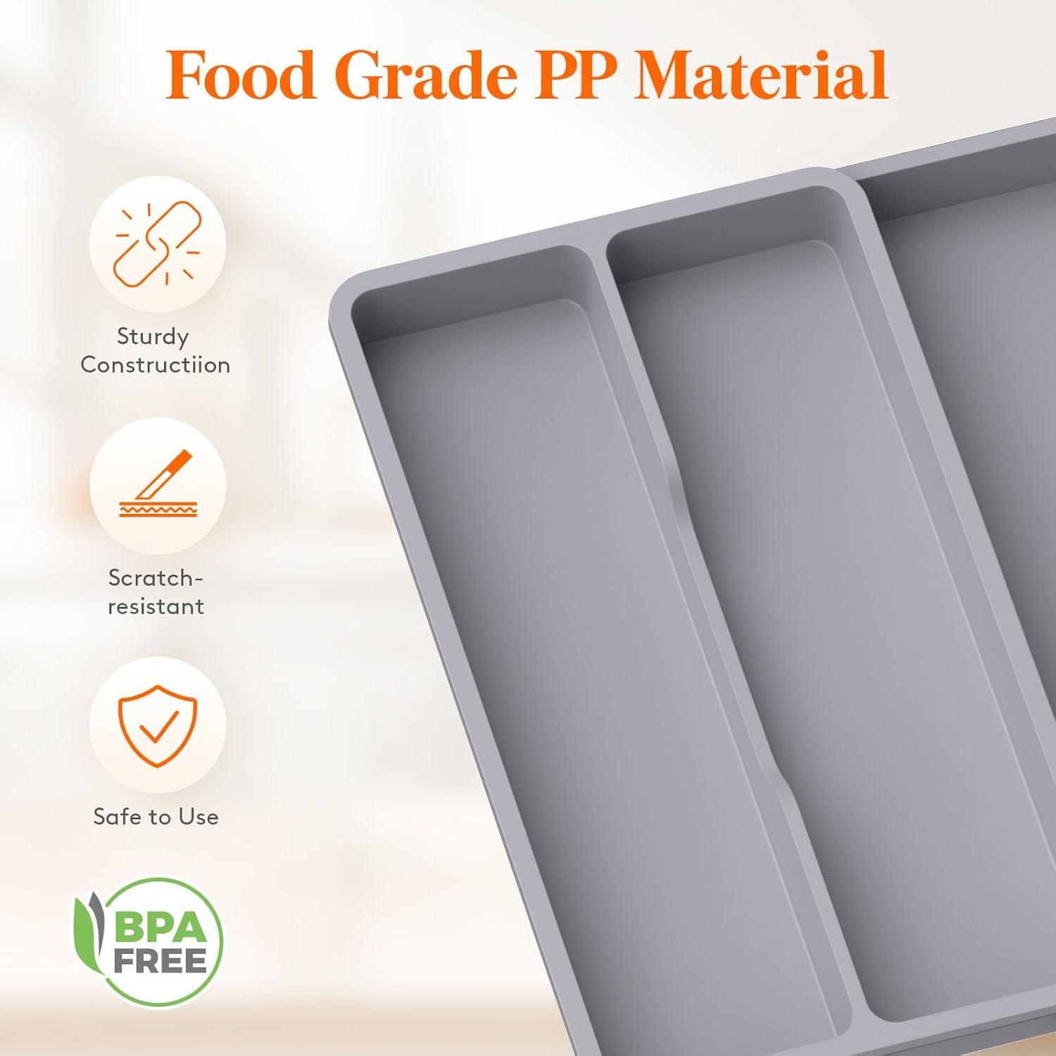 Robust and Safe: This kitchen drawer organizer is crafted from premium PP material, BPA-free and built to last. It ensures your silverware is stored in a healthy, safe environment for worry-free use