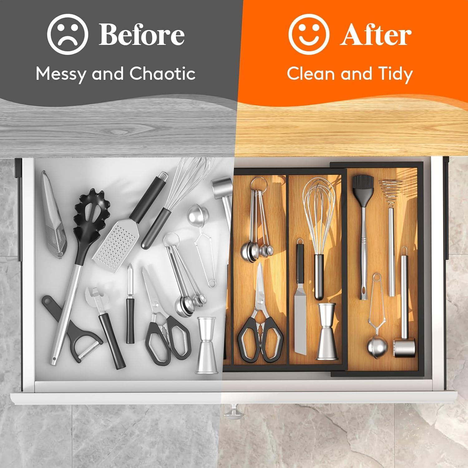 Lifewit Utensil Organizer for Kitchen Drawer, Bamboo Cooking Utensil Tray, Expandable Cutlery Silverware Flatware Holder, Adjustable Spatula Tools Gadgets Storage Divider, Large, Natural and Black(Natural & Black)