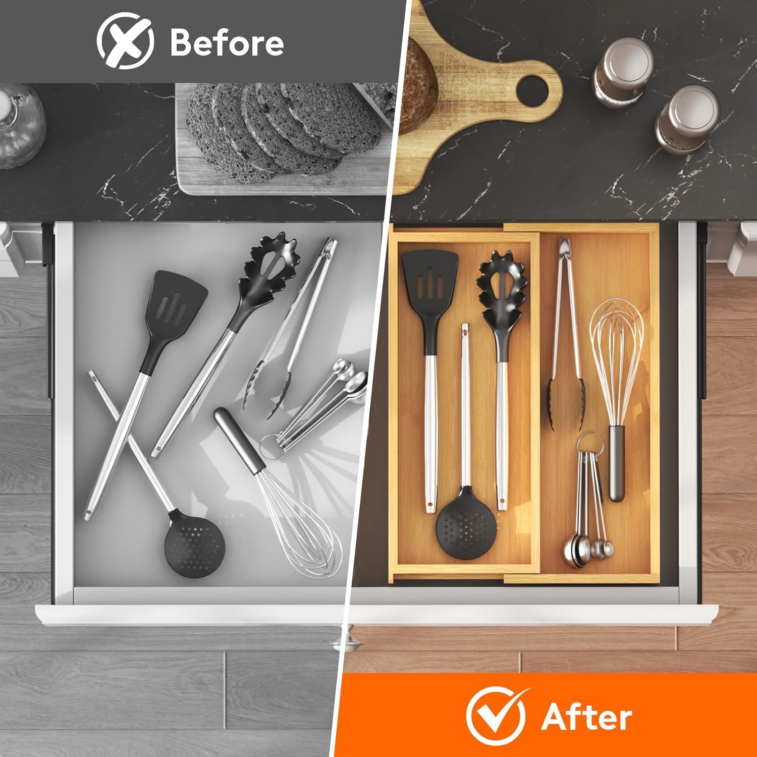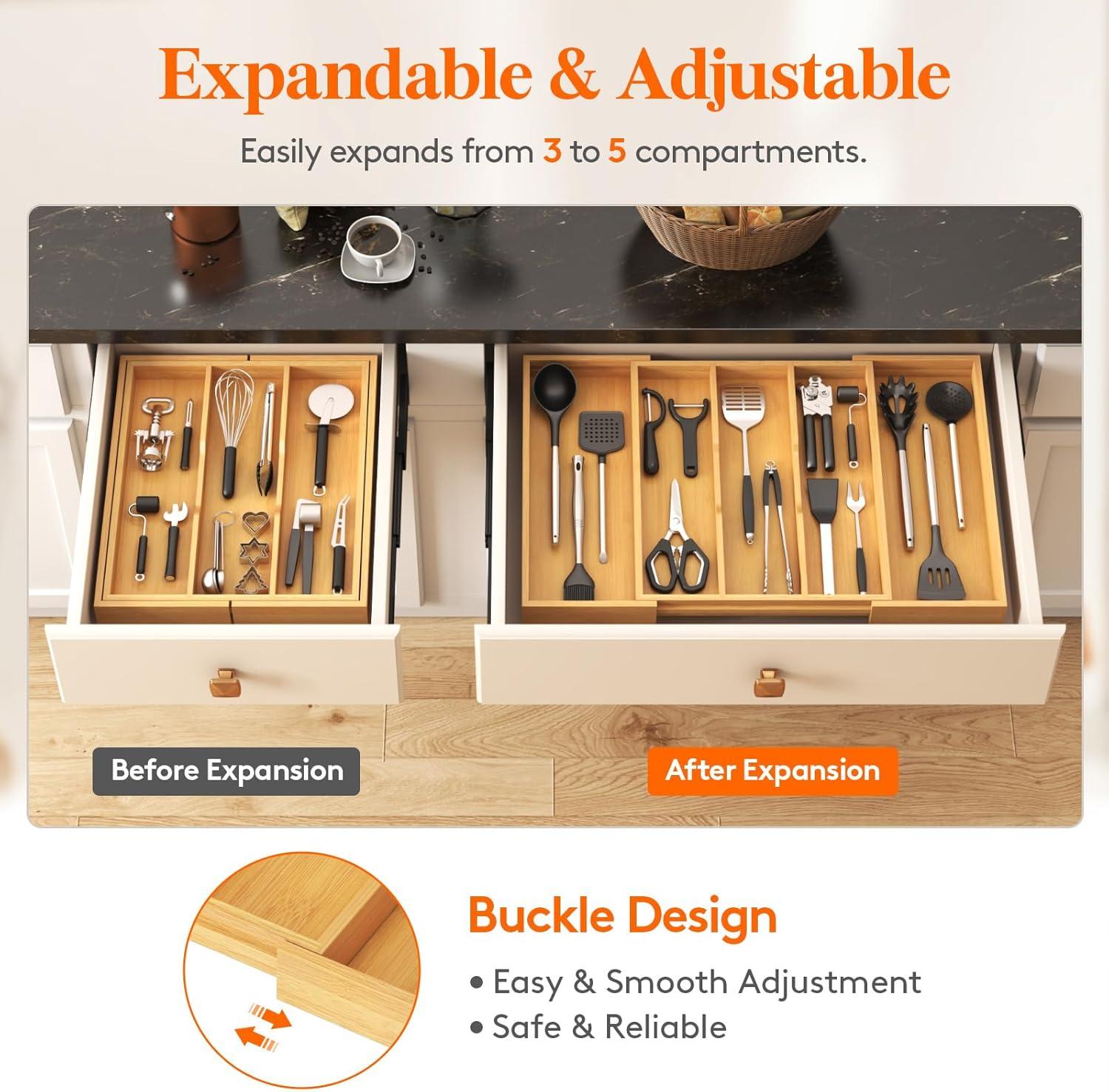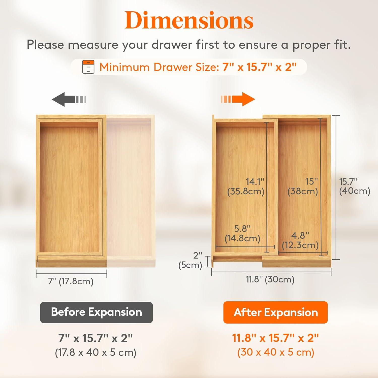 Expandable Design: This utensil organizer for kitchen drawers can extend from 3 to 5 compartments, accommodating different drawer sizes ranging from 12.6 to 22.4 inches wide. Its folded dimensions are 12.6 x 15 x 2 inches, expanding to 22.4 x 15 x 2 inches