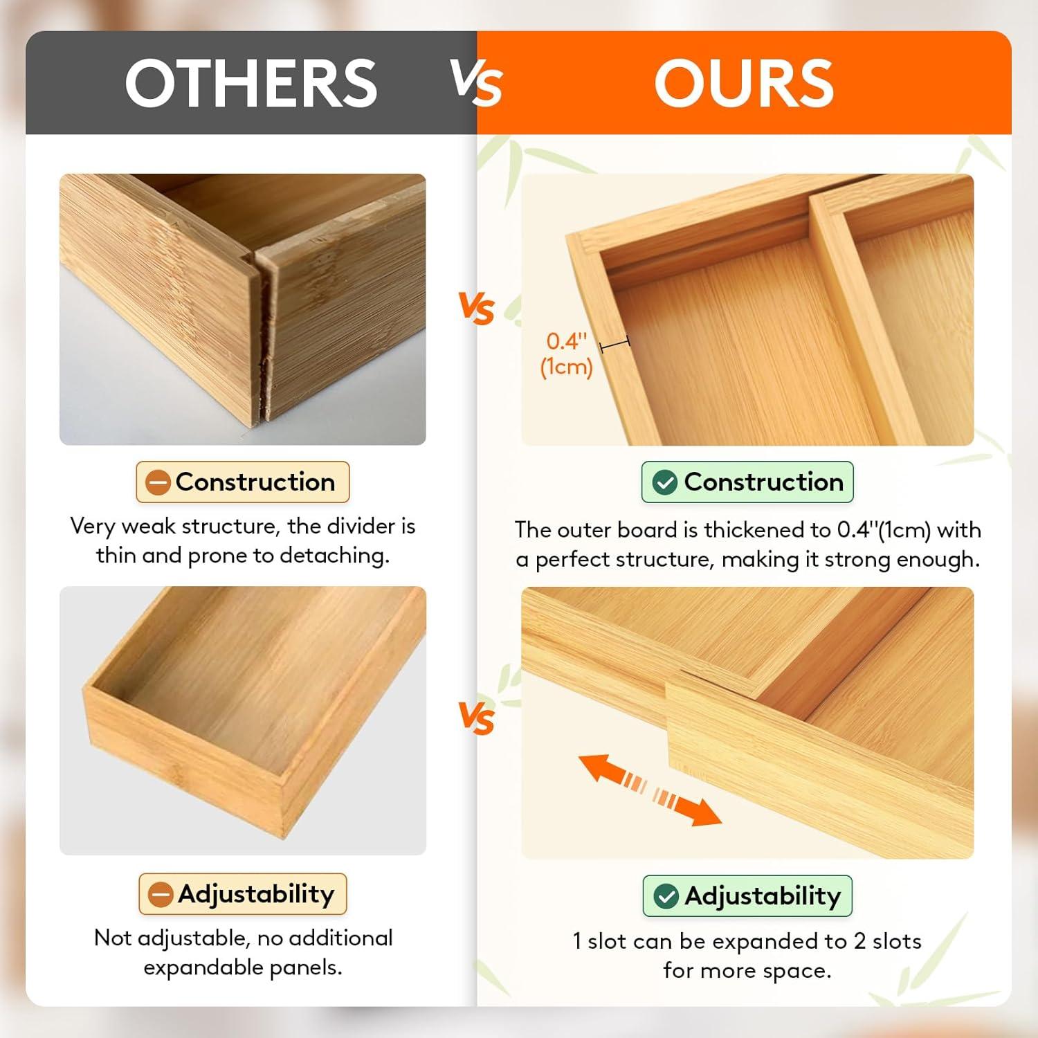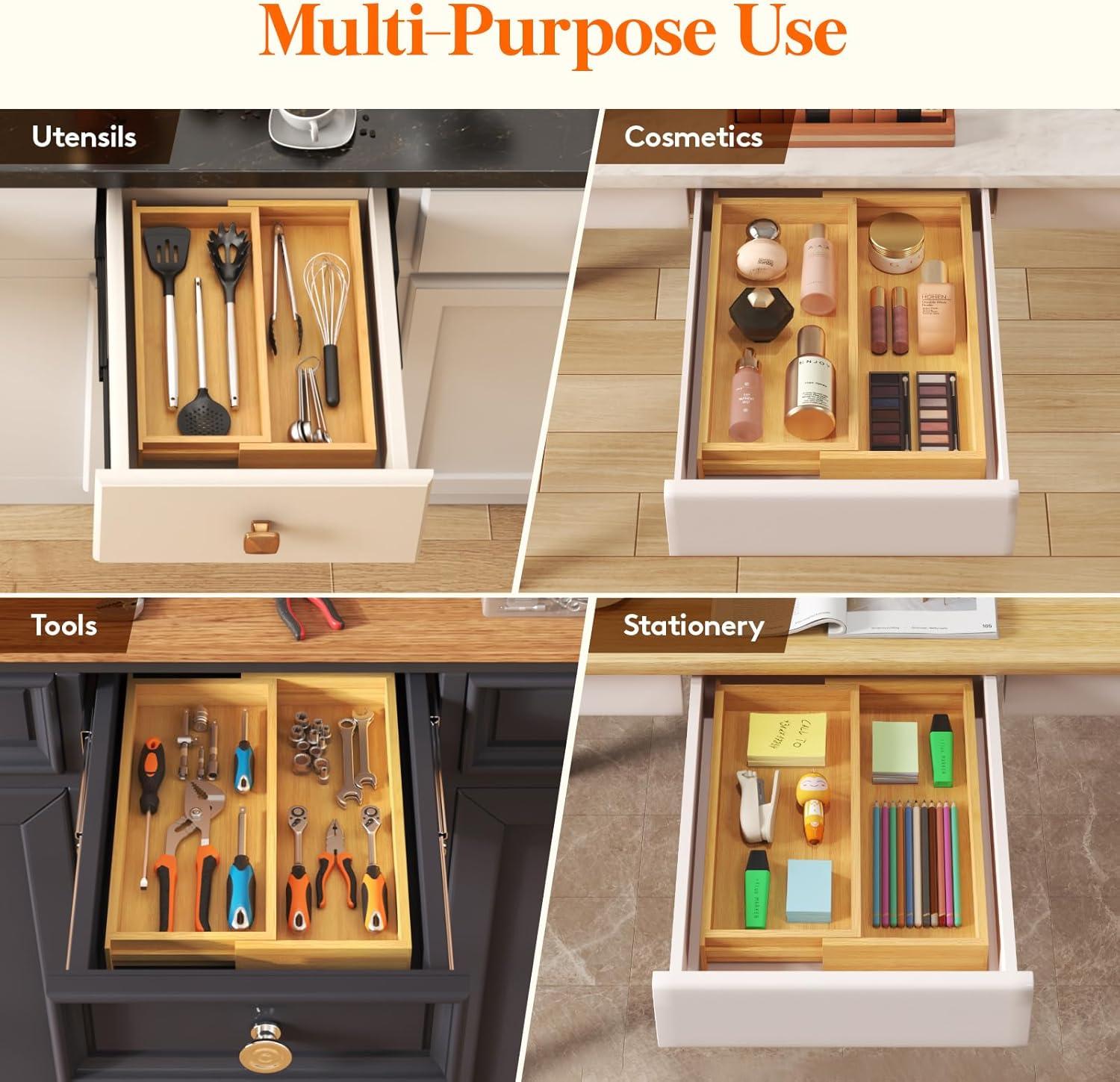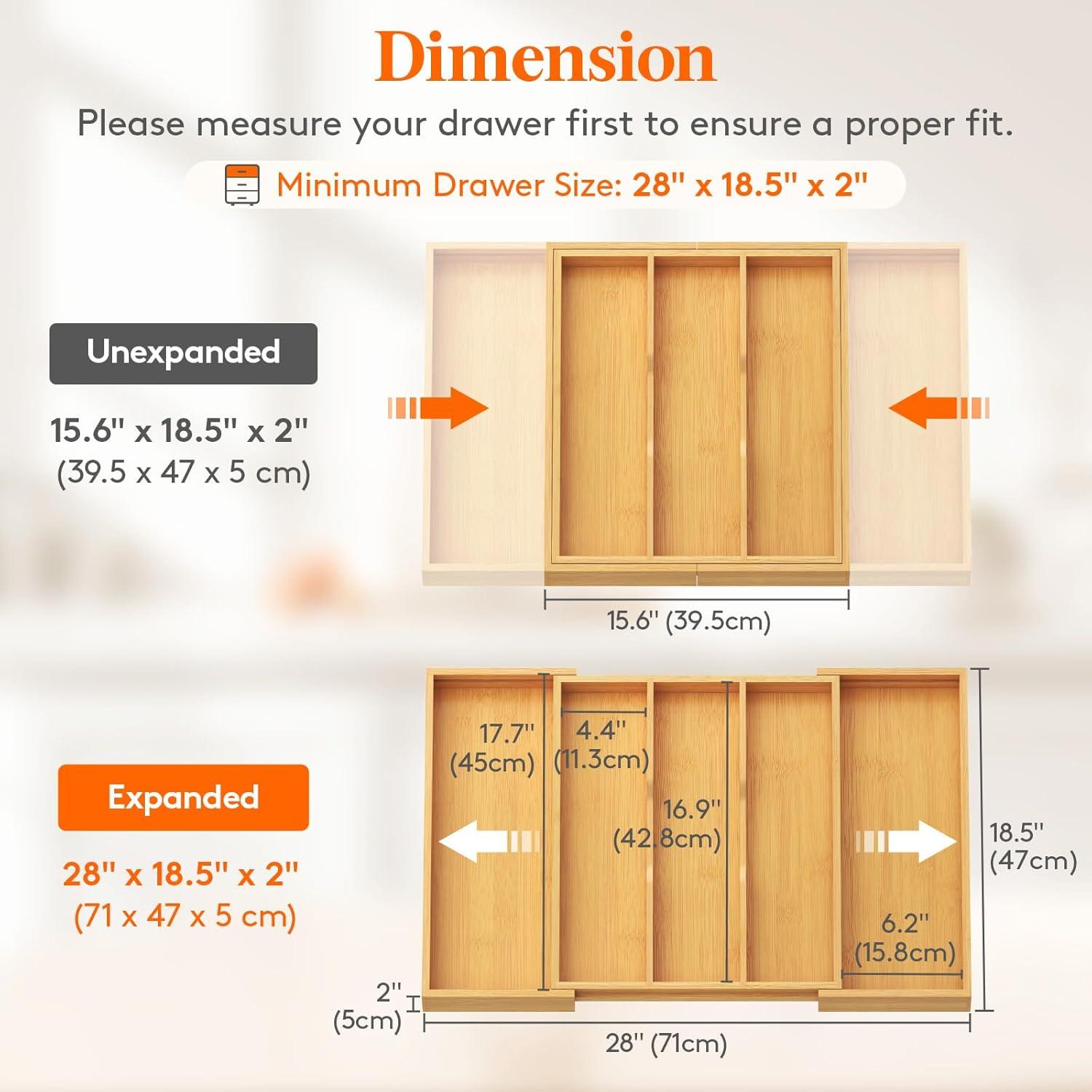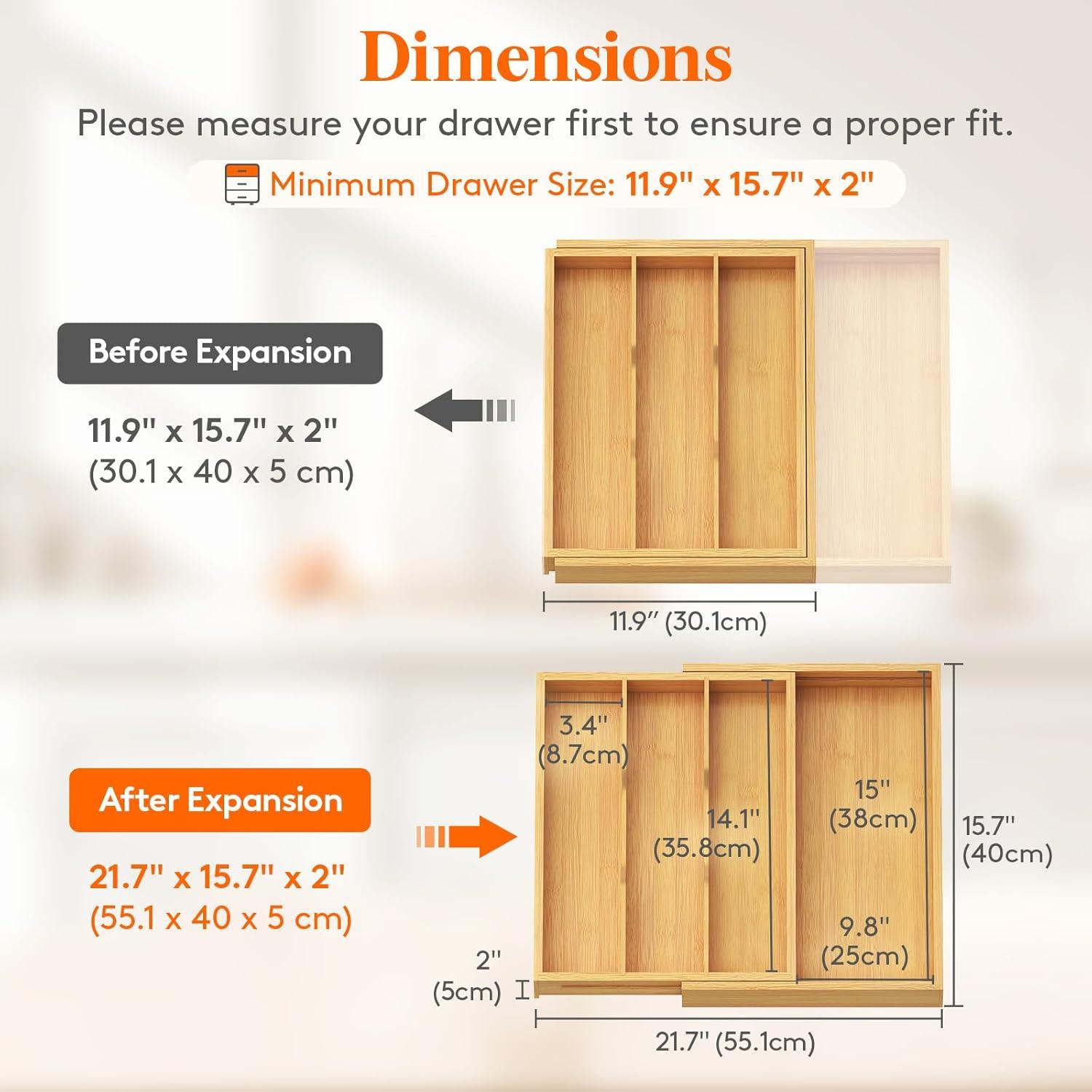 Expandable Design: This utensil organizer for kitchen drawers can extend from 3 to 5 compartments, accommodating different drawer sizes ranging from 12.6 to 22.4 inches wide. Its folded dimensions are 12.6 x 15 x 2 inches, expanding to 22.4 x 15 x 2 inches