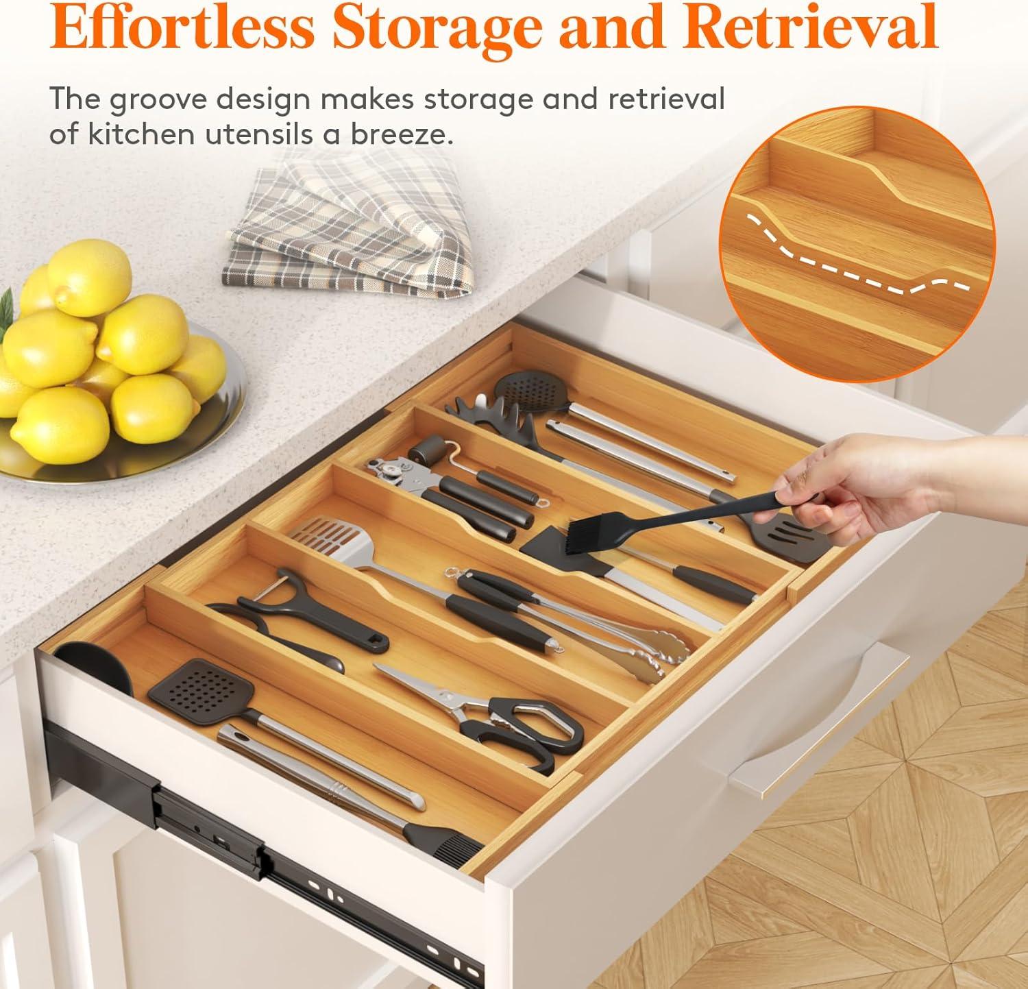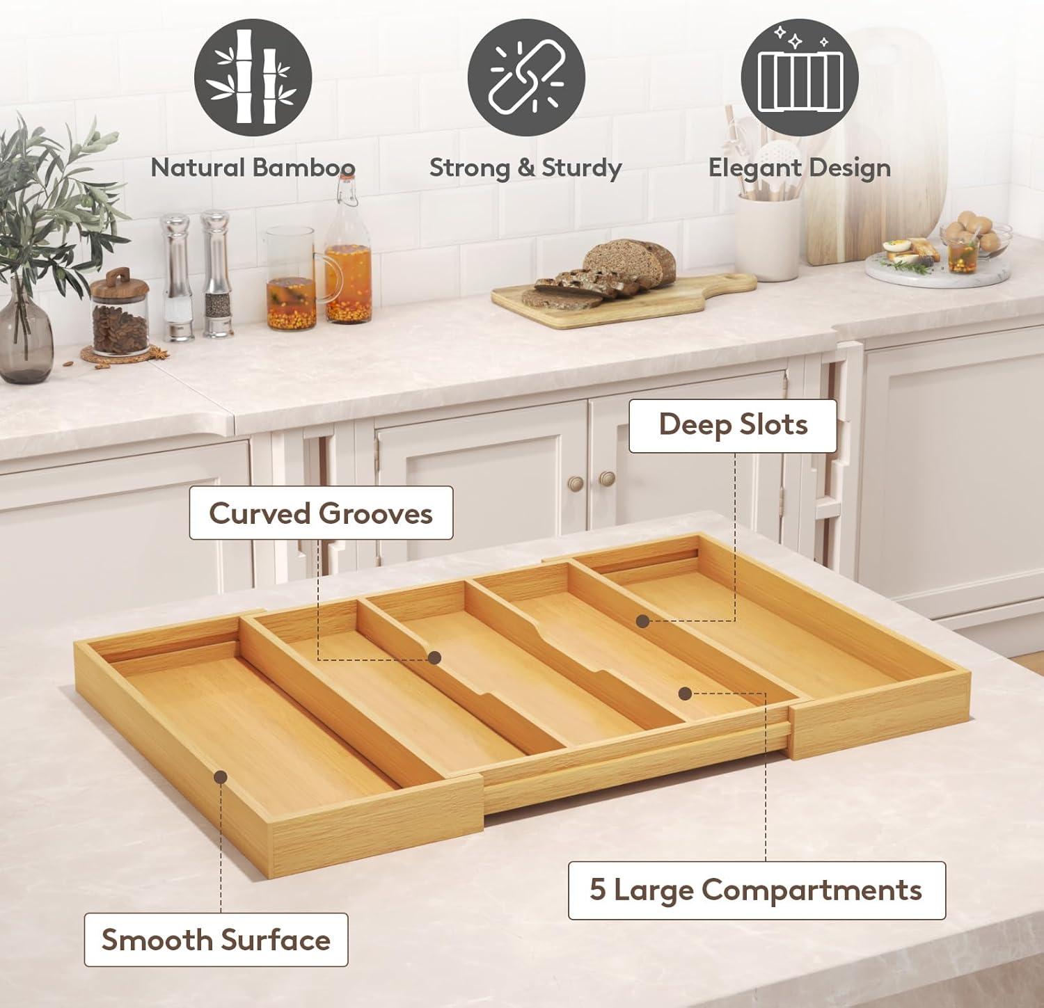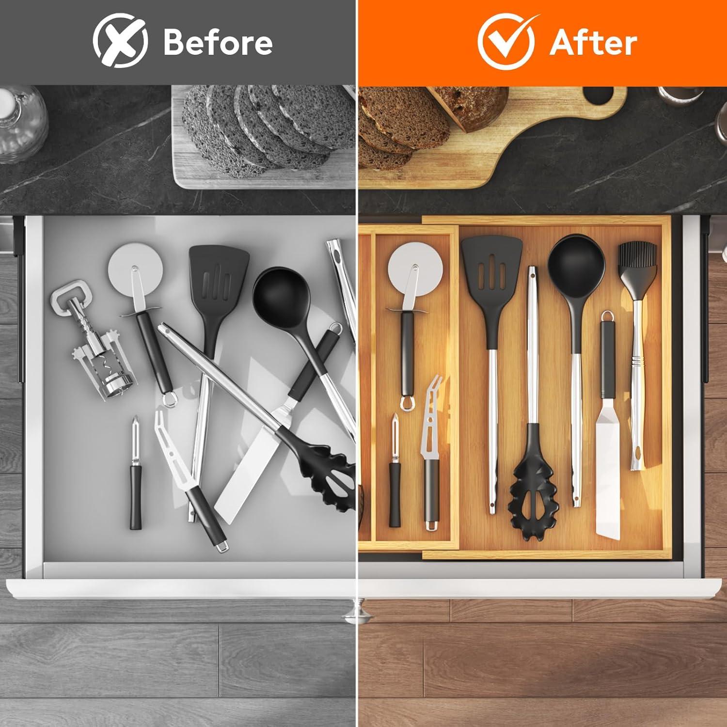 Lifewit Utensil Organizer for Kitchen Drawer, Bamboo Cooking Utensil Tray, Expandable Cutlery Silverware Flatware Holder, Adjustable Spatula Tools Gadgets Storage Divider, Large, Natural and Black(Natural & Black)