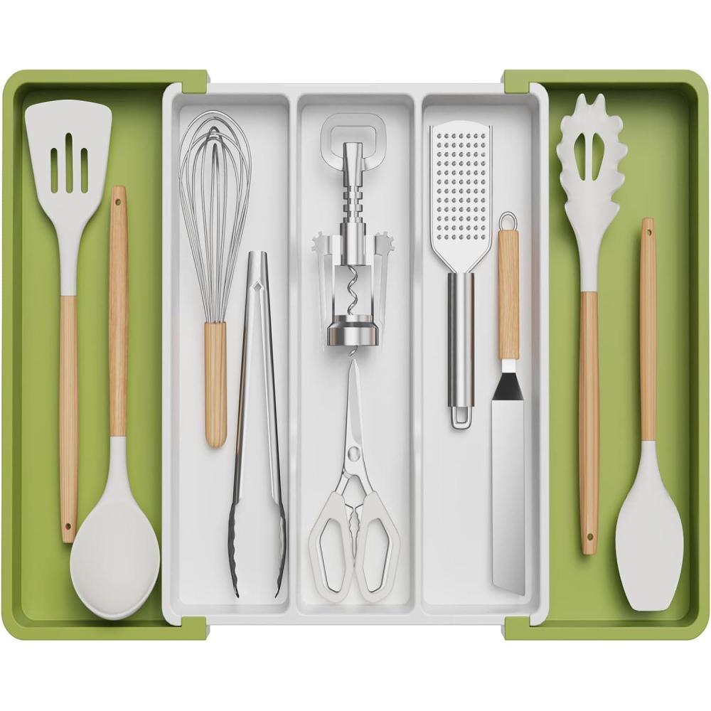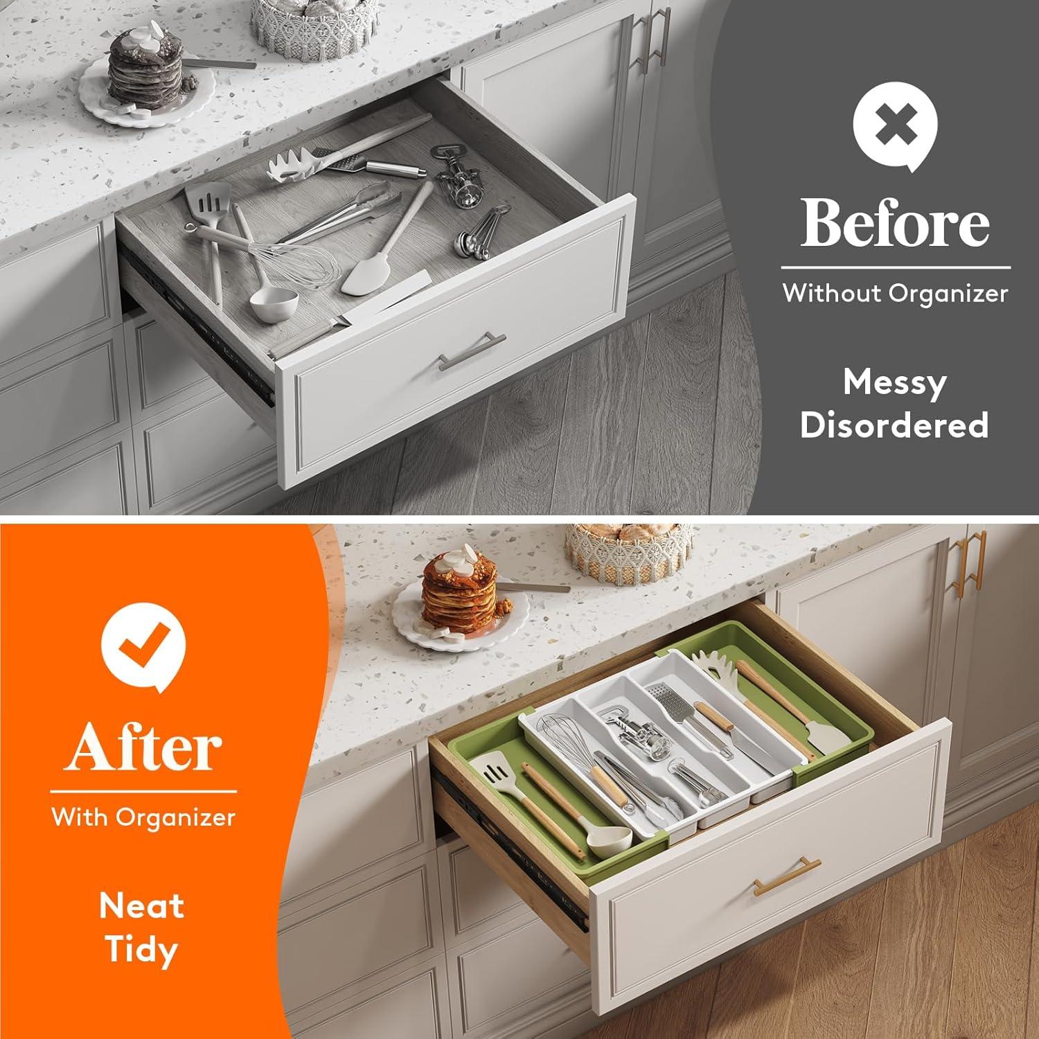 Lifewit Utensil Organizer for Kitchen Drawers, Expandable Cooking Utensil Tray, Adjustable Cutlery Silverware Flatware Holder, Plastic Kitchen Spatula Tools and Gadgets Storage Divider, Large, Black(Green&White)