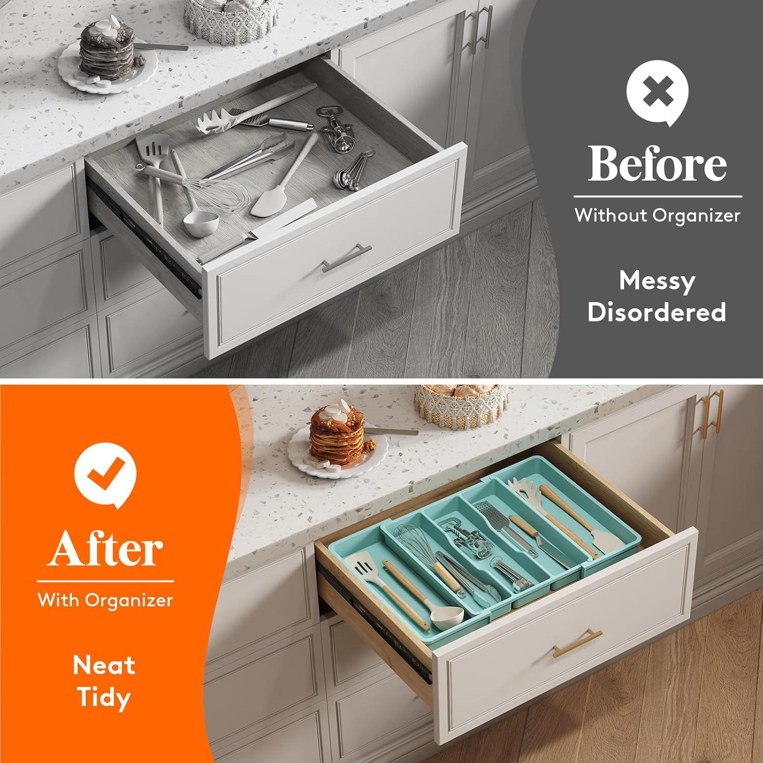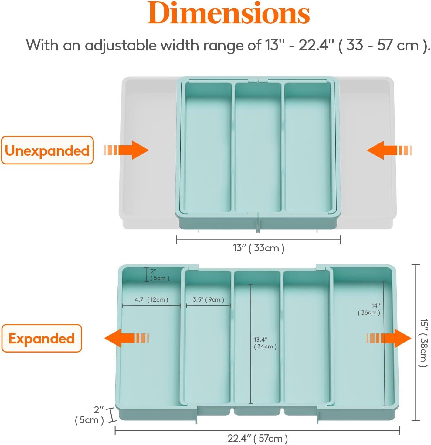 Expandable and Adjustable: The utensil organizer for kitchen drawers can be expanded from 3 slots to 5 slots, offering extra storage space for utensils. It is adjustable to fit different drawer sizes, ranging from 13 to 22.4 inches wide. When folded, it measures 13″ x 15″ x 2″, but expands to 22.4″ x 15″ x 2″ for added space.