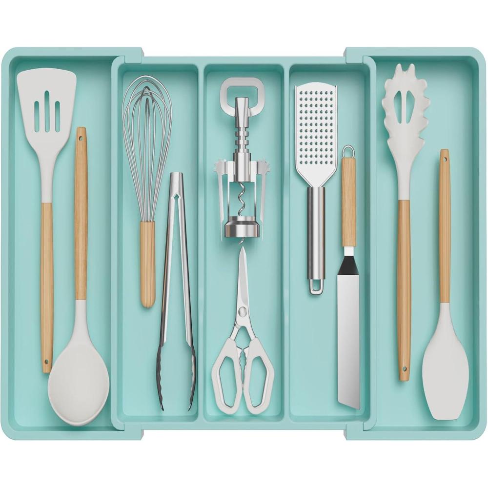 Lifewit Utensil Organizer for Kitchen Drawers, Expandable Cooking Utensil Tray, Adjustable Cutlery Silverware Flatware Holder, Plastic Kitchen Spatula Tools and Gadgets Storage Divider, Large, Black(Turquoise)
