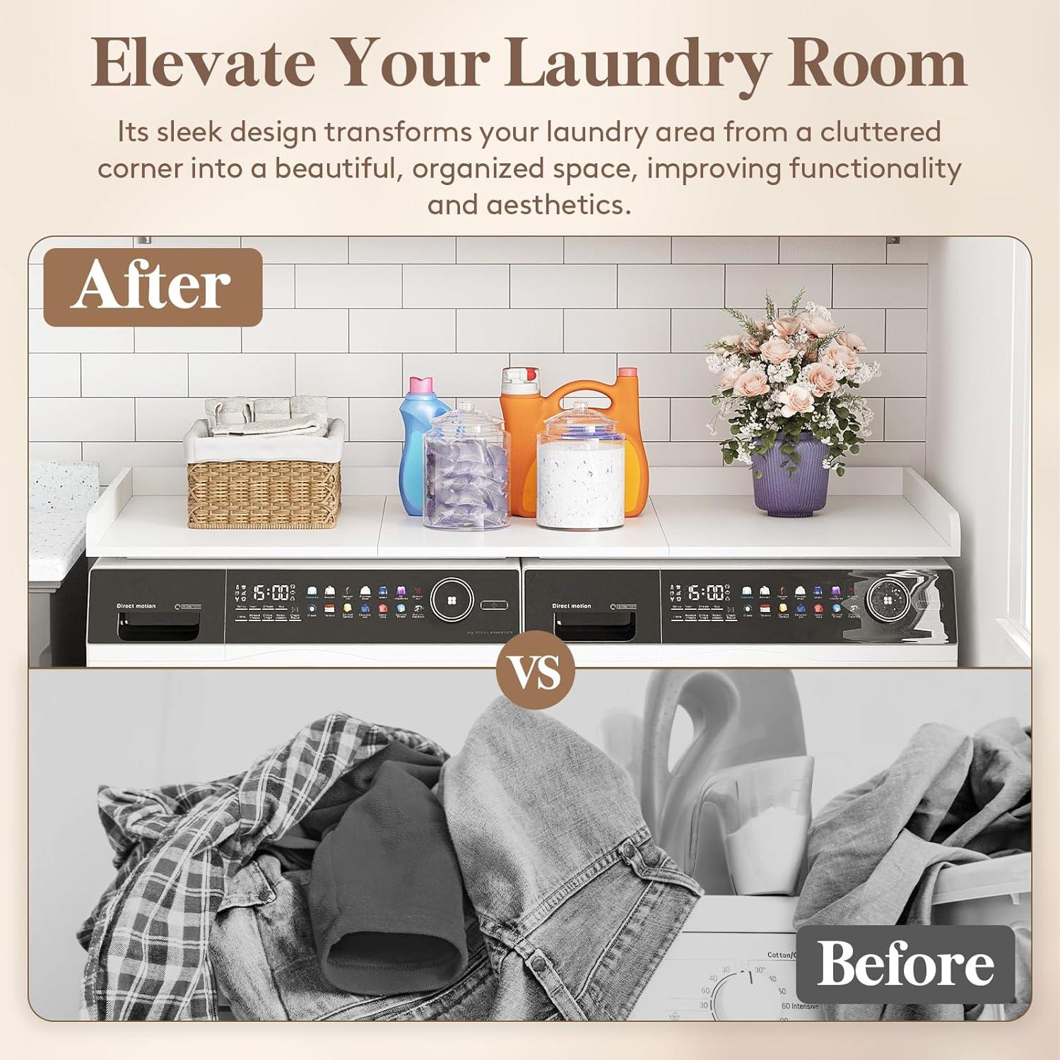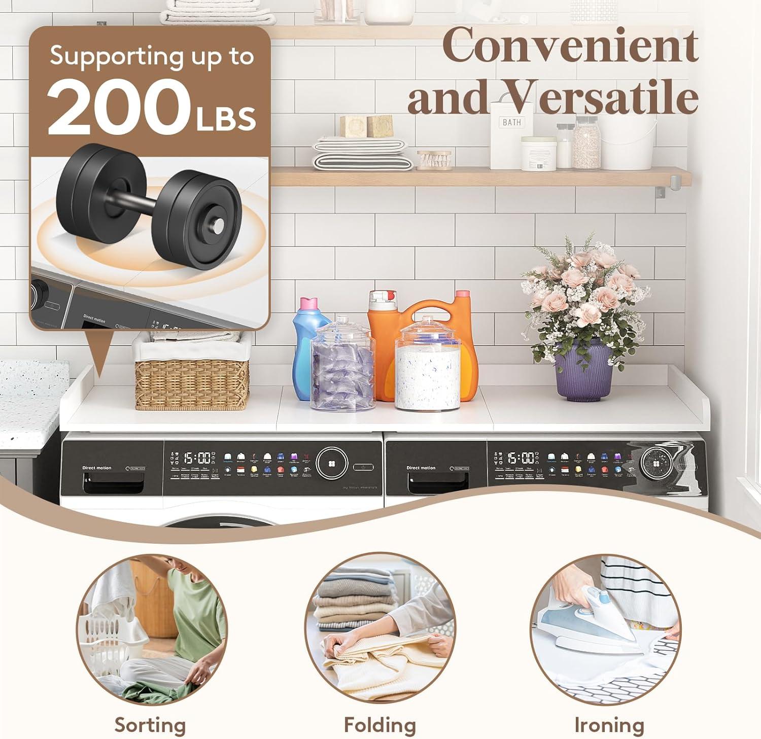 Convenient and Versatile: Maximize the top space of washer and dryer with a spacious work area ideal for sorting, ironing, and folding clothes, as well as organizing laundry detergents and supplies. Supporting up to 200 pounds, it’s built for daily use