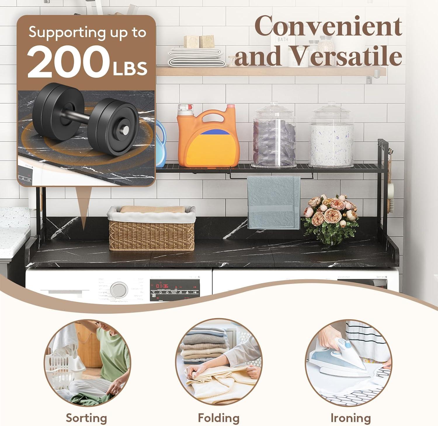 Convenient and Versatile: Maximize the top space of washer and dryer with a spacious work area ideal for sorting, ironing, and folding clothes, as well as organizing laundry detergents and supplies. Supporting up to 200 pounds, it’s built for daily use