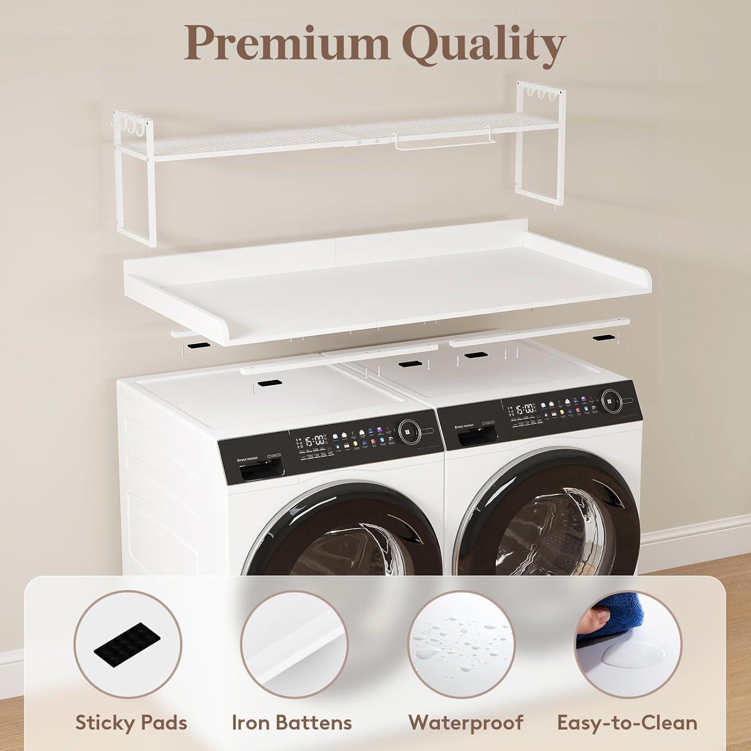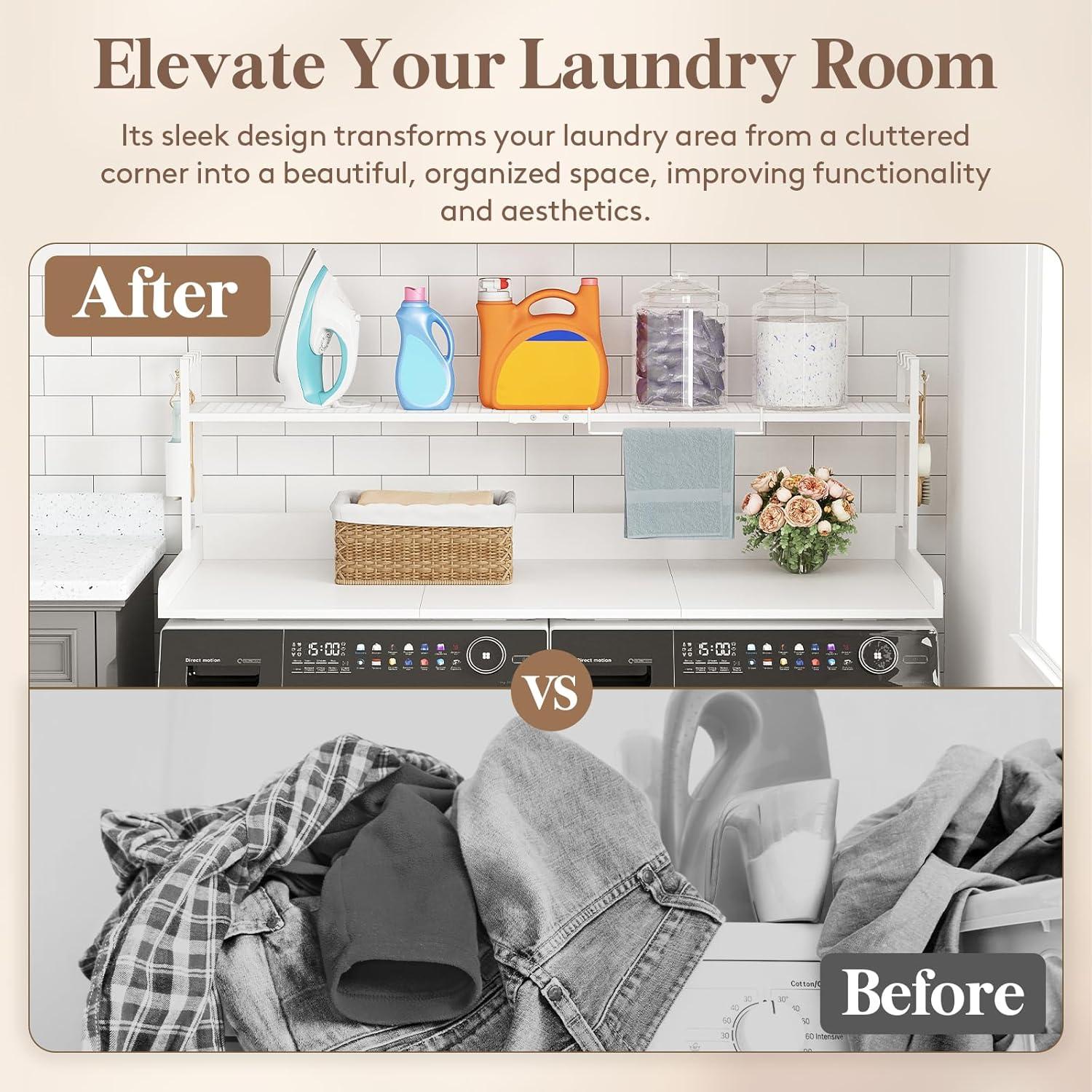 Convenient and Versatile: Maximize the top space of washer and dryer with a spacious work area ideal for sorting, ironing, and folding clothes, as well as organizing laundry detergents and supplies. Supporting up to 200 pounds, it’s built for daily use